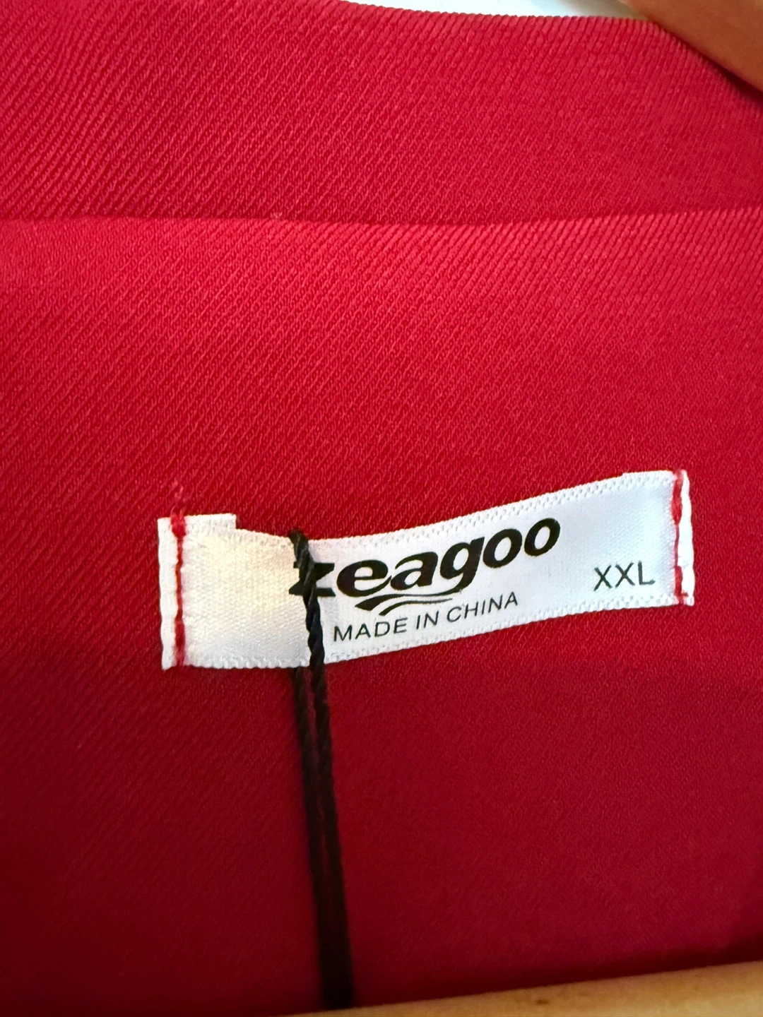This is a woman’s red blazer from Zeagoo. It's a size XXL and features a classic single-button closure. The material appears to be a lightweight, textured fabric.