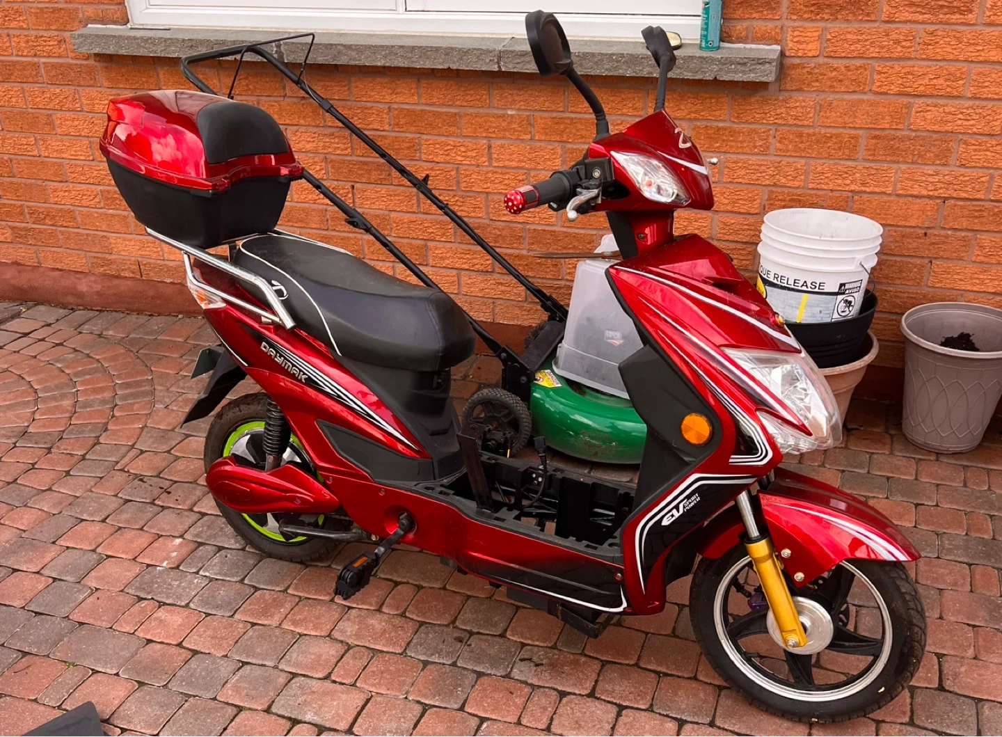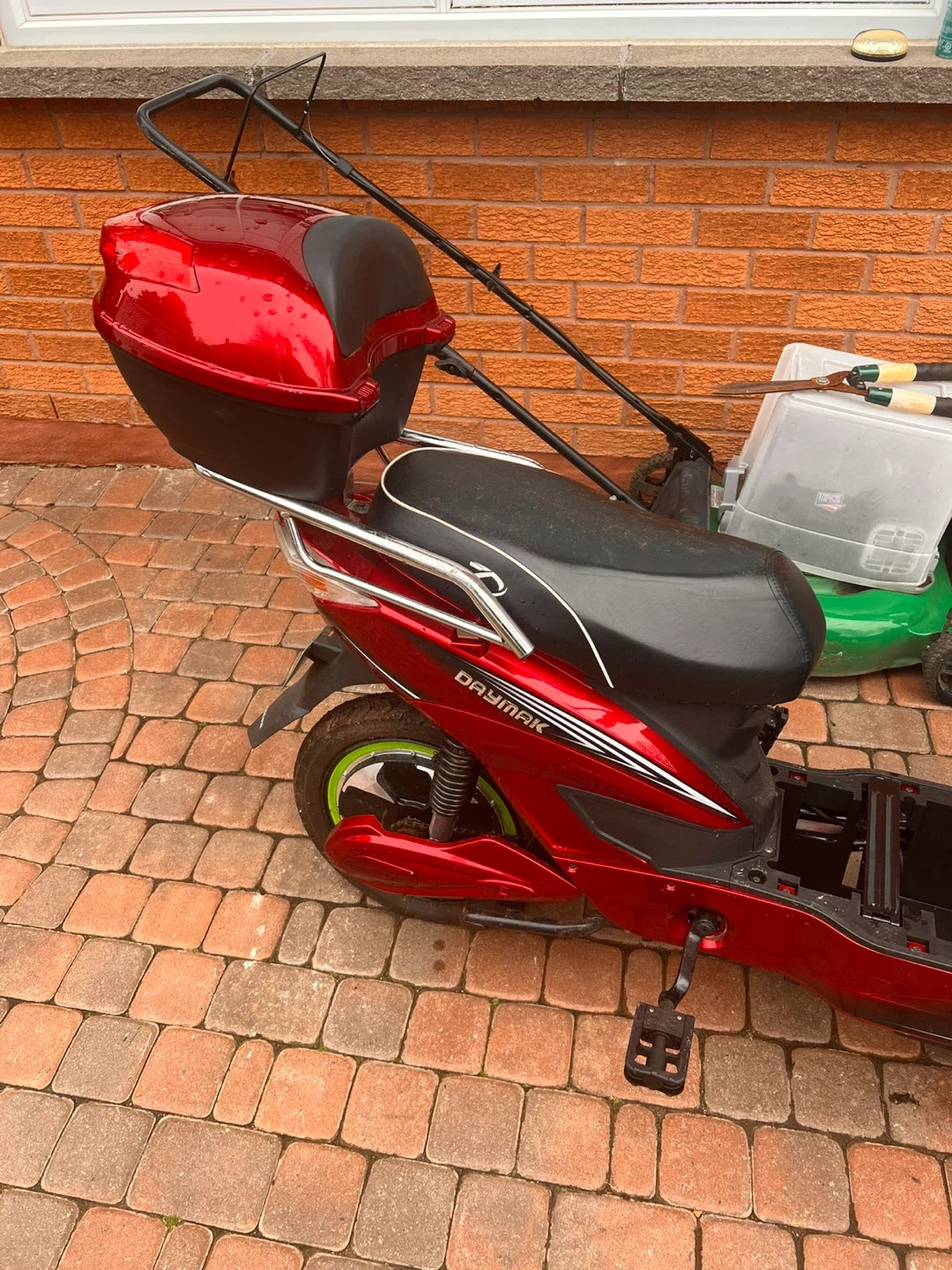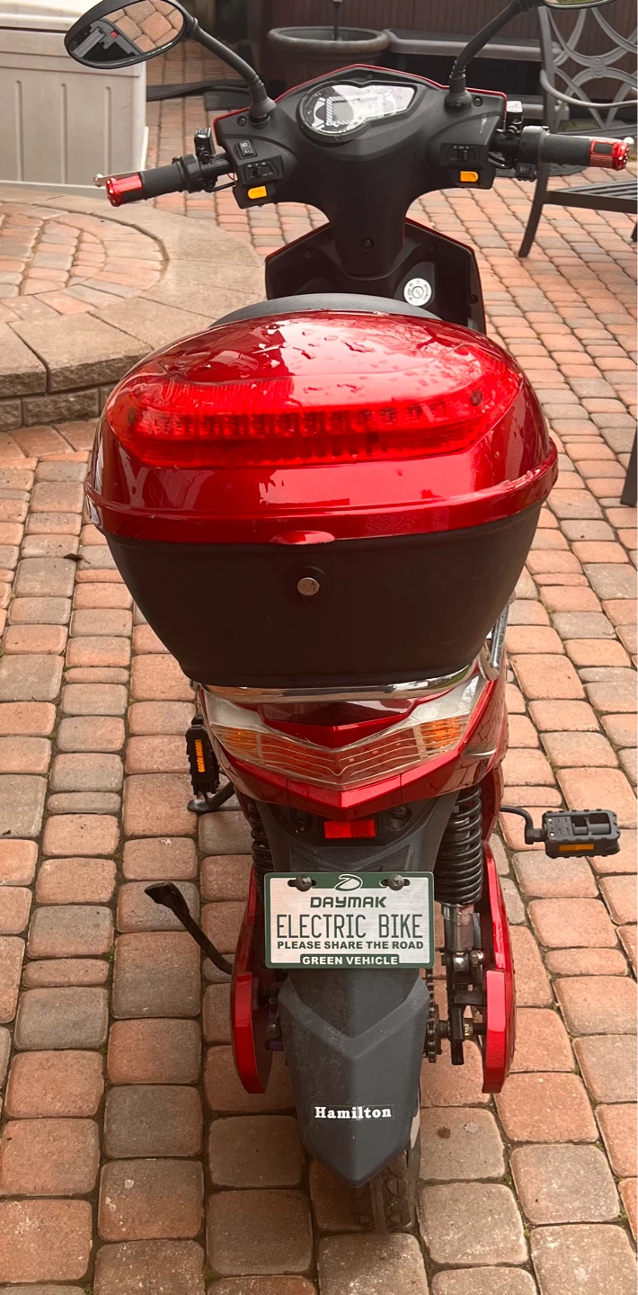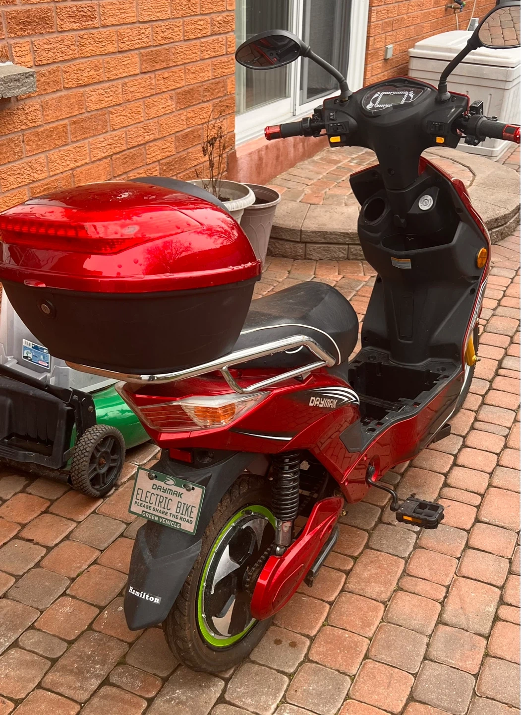 This is a red Daymak electric bike scooter. It features a comfortable seat and a rear storage box. Perfect for zipping around town.