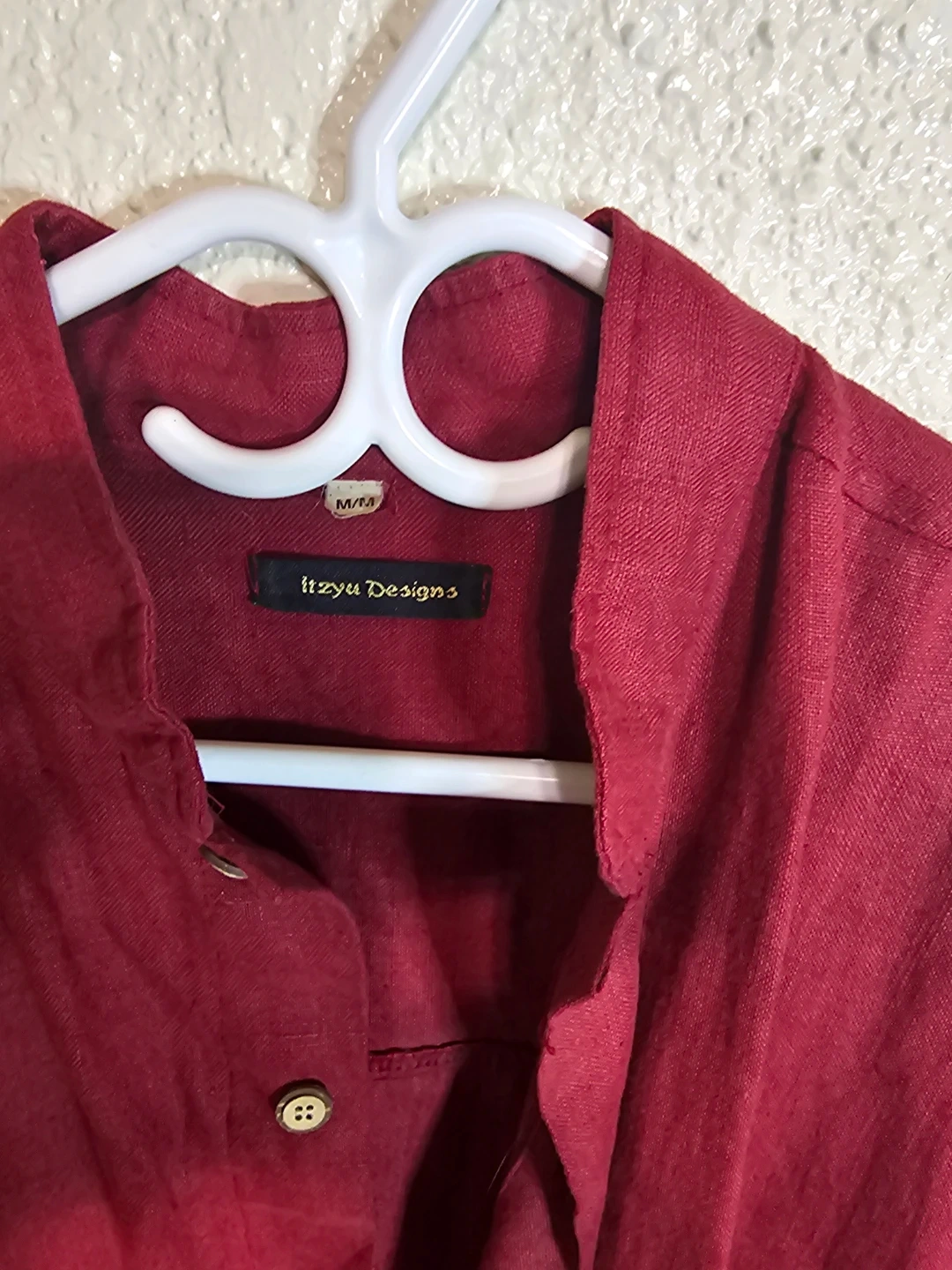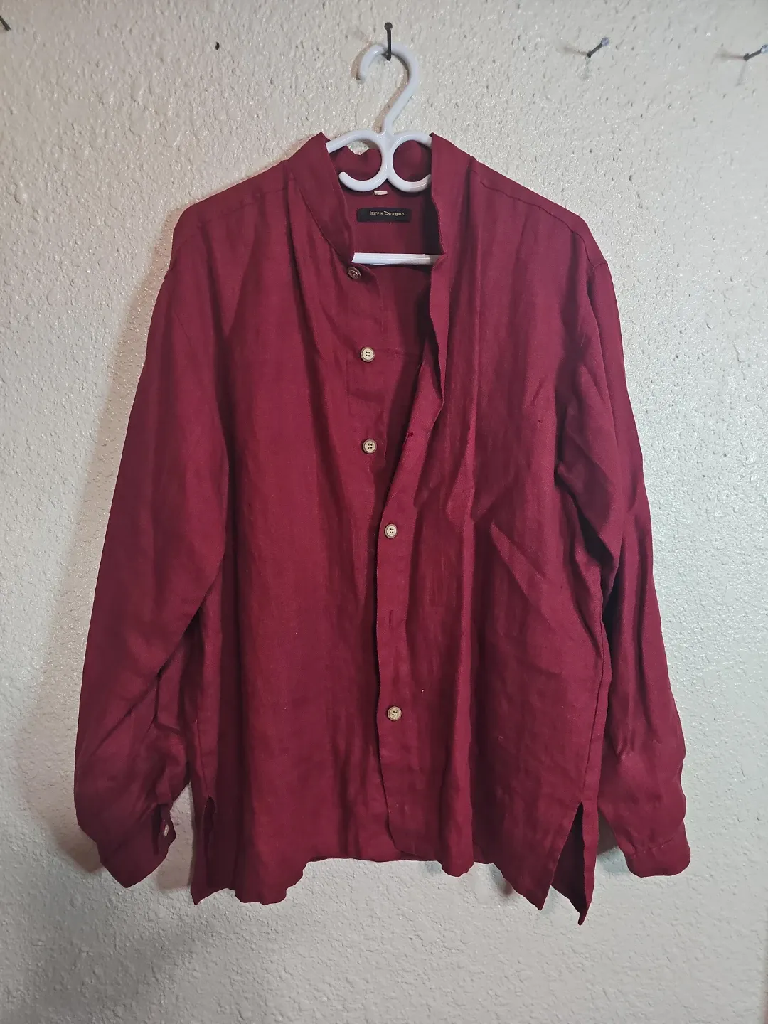 This men's Itsyu Designs shirt is made from a linen blend in a rich burgundy colour. It features a band collar with a button-up front and long sleeves. Size is M/M.