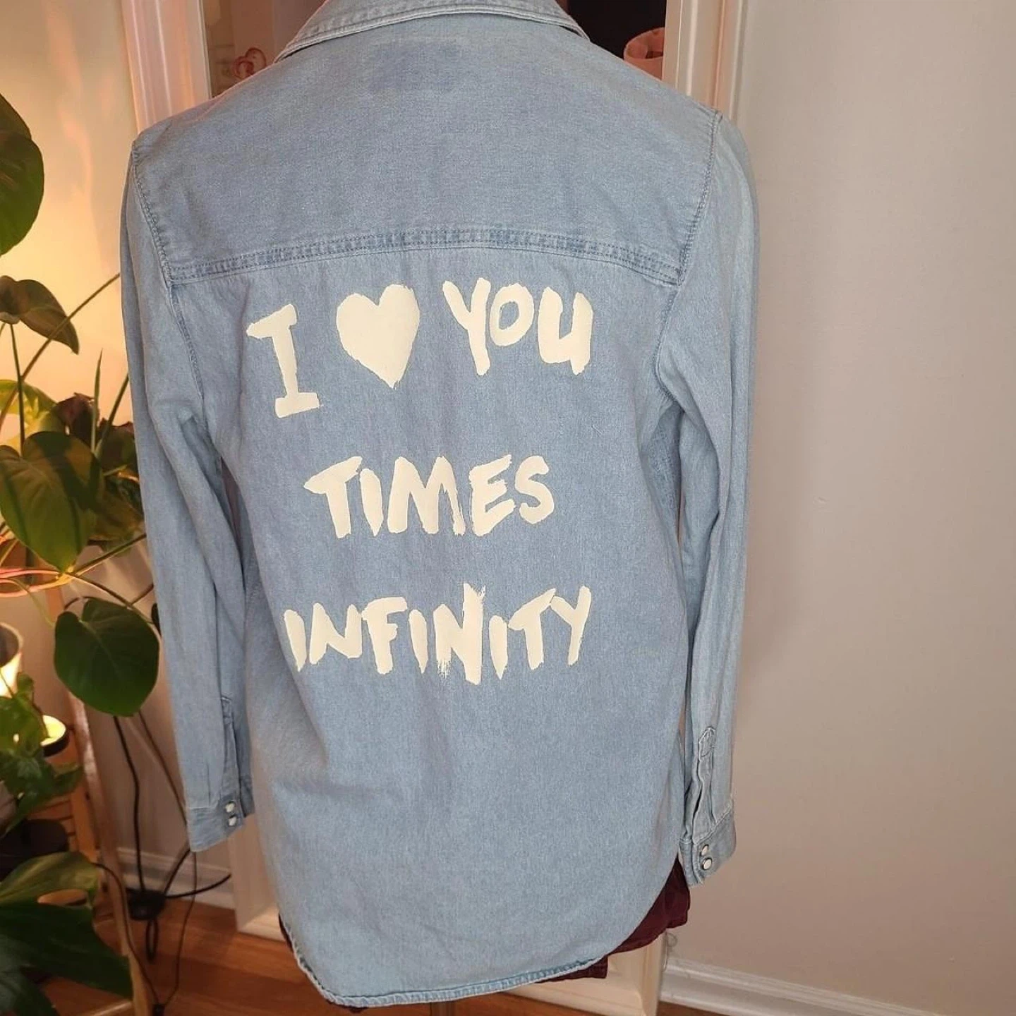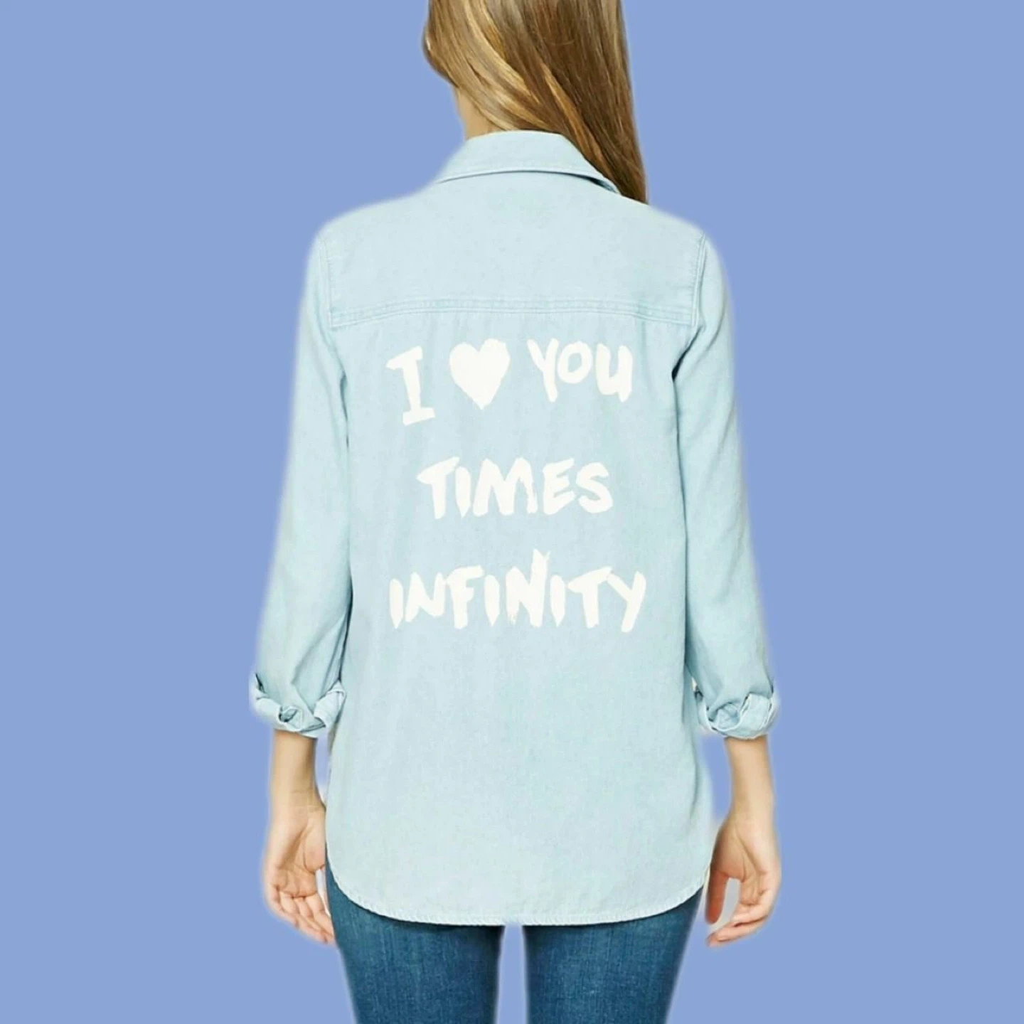 It's a size small and has a unique design on the back that says "I ❤️ You TIMES INFINITY".