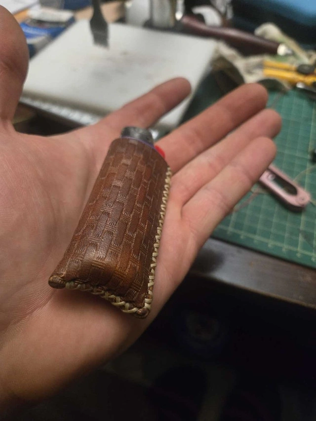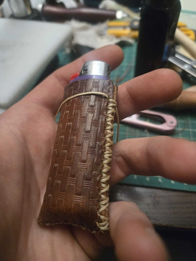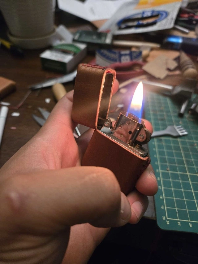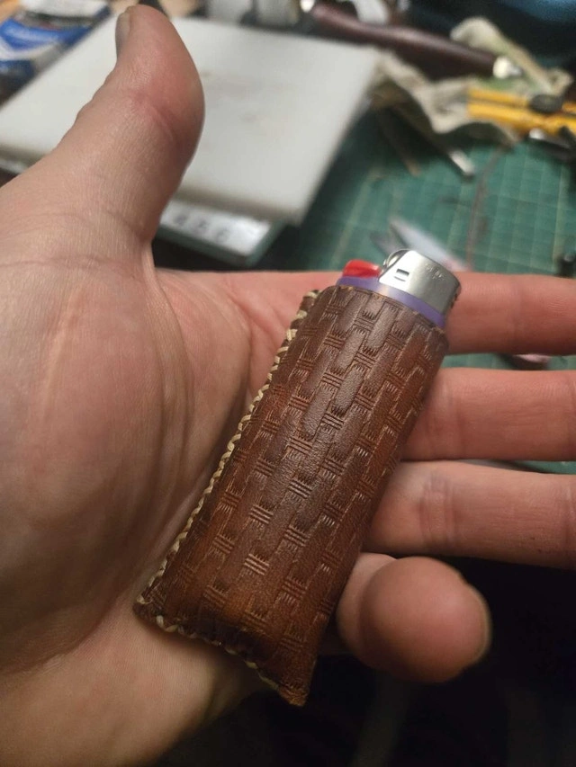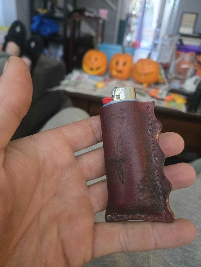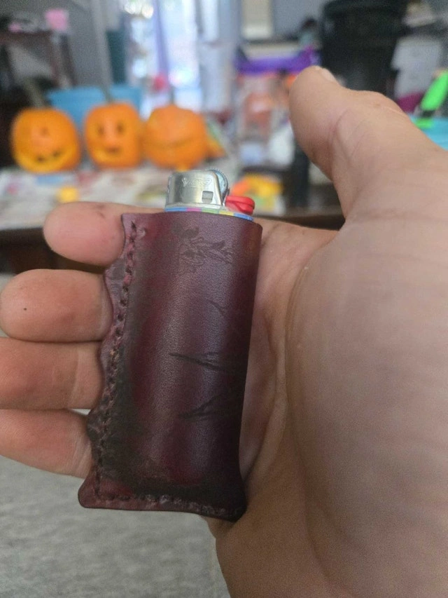 Hand crafted leather lighter covers for Zippo and Bic lighters. Made with high-quality veg-tanned leather. Available in multiple colors for dyes and threads. Each piece is cut, dyed, and stitched by hand. Tooling and laser engraving can be added for a personalized look. Large Bic lighter coozies start at $25 up to $45 depending on style. Zippo covers are $50, including dye and thread color. Tooling, border stamping, and laser engraving are extra, with prices varying based on detail and complexity. Please contact me for information and pricing. I also create other custom leather items like wallets, slings, belts, and sheaths.