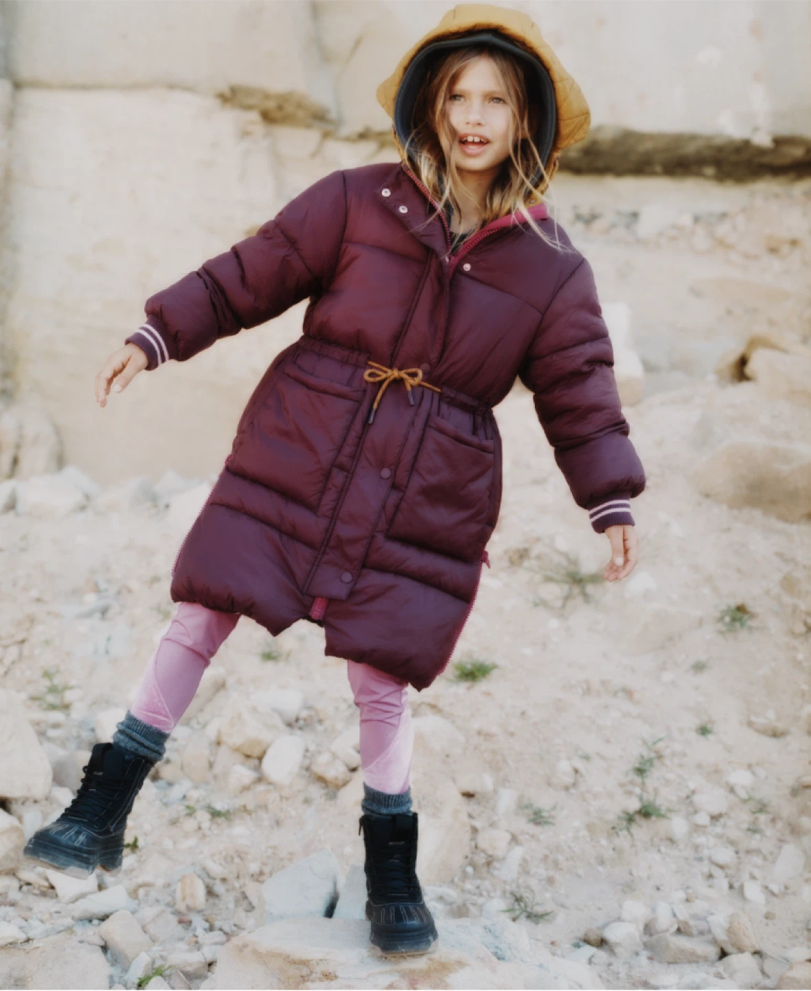 This is a Zara Kids puffer coat, perfect for keeping your little one warm! The coat is a lovely burgundy colour with a mustard yellow hood and pink lining.