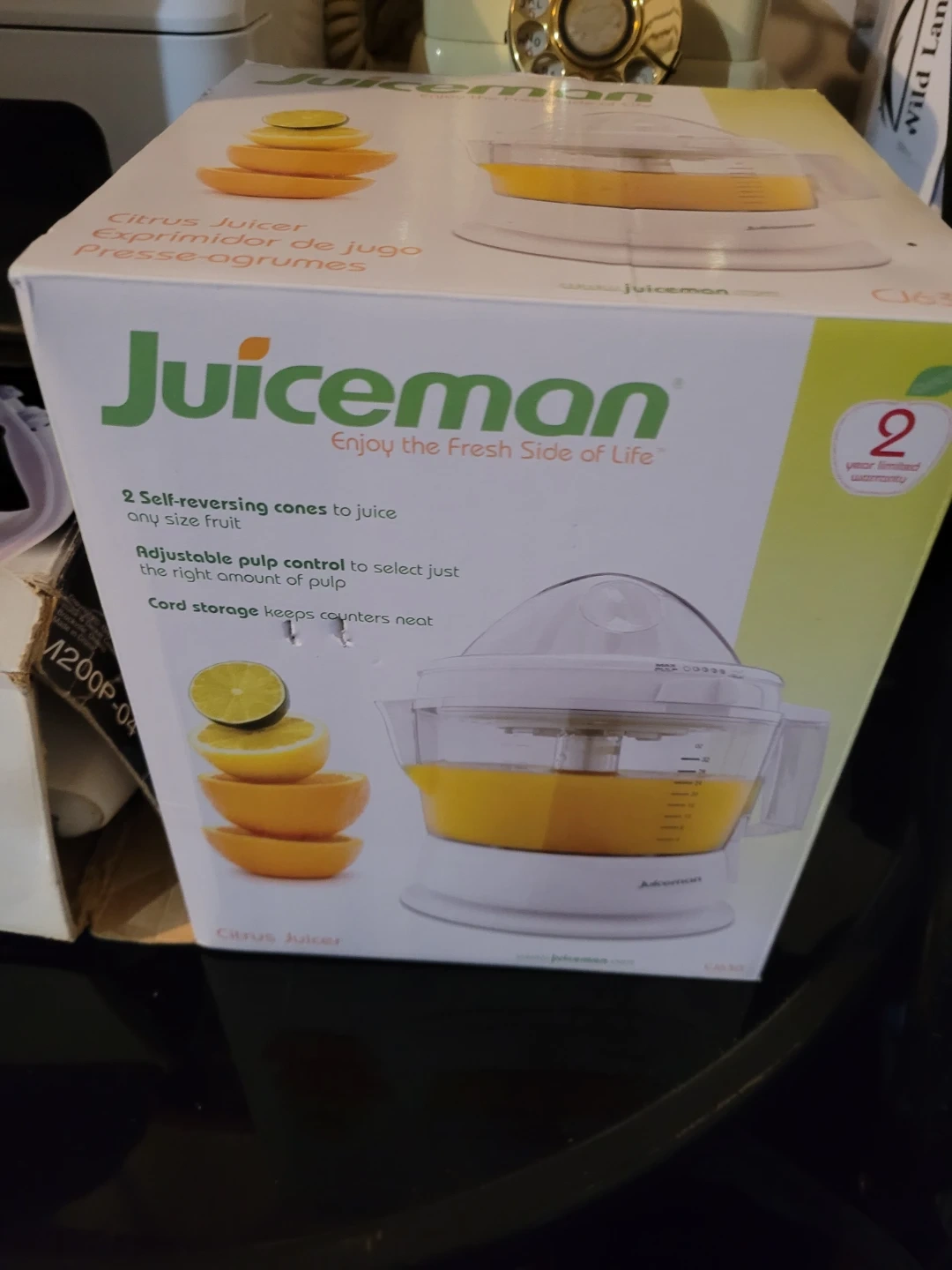 128Selling a Juiceman Citrus Juicer, model CJ630! It's in like-new condition and comes with the original box. This juicer features two self-reversing cones to juice any size fruit, and adjustable pulp control to select just the right amount of pulp. Plus, it has cord storage to keep your counters neat!