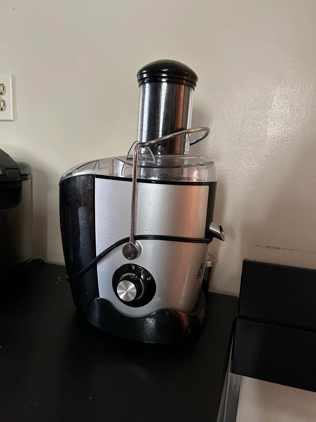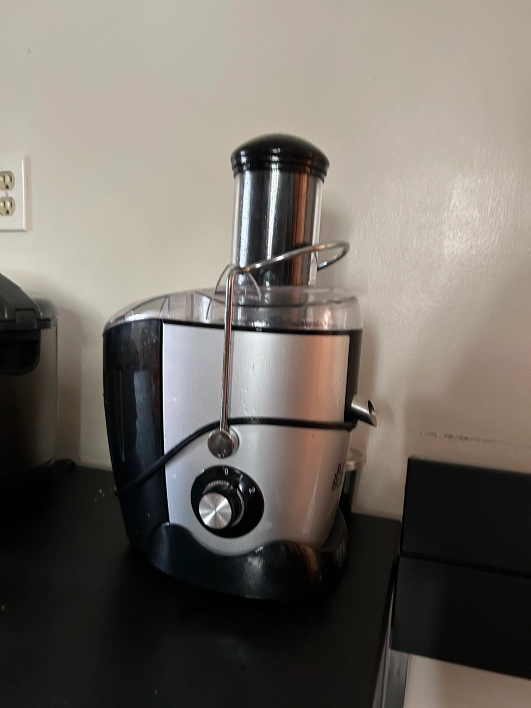 34Silver and black juicer. Has a lever and a knob to control the speed. Lost the cup and brush that came with it. Selling as is. Will be cleaned upon pick up.