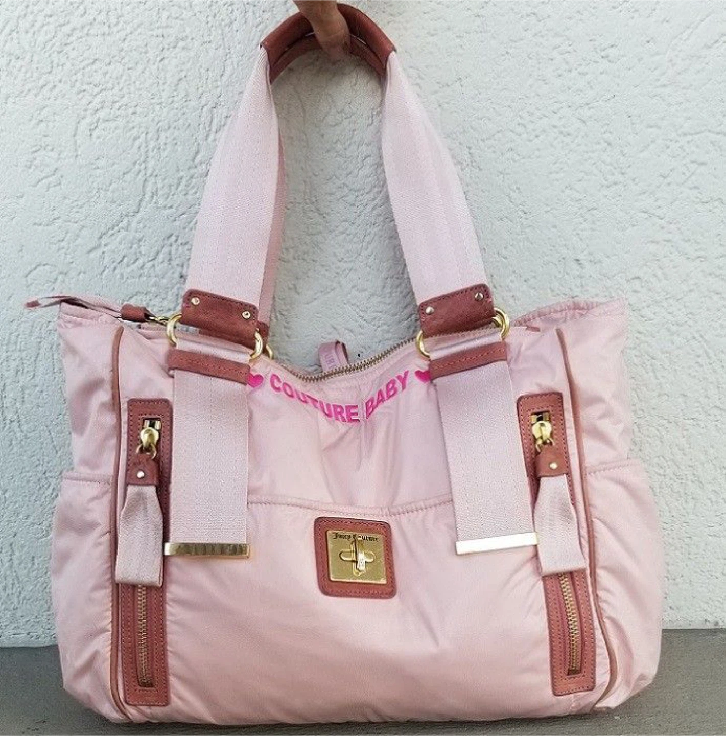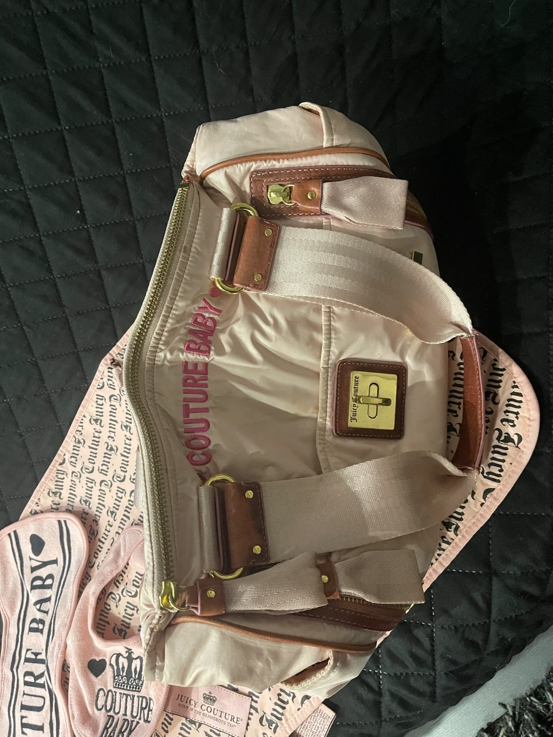 10Selling a cute Juicy Couture baby diaper bag with a matching changing pad and bib set! The bag is pink with brown accents and has the "Couture Baby" logo on the front. Perfect for any stylish parent!