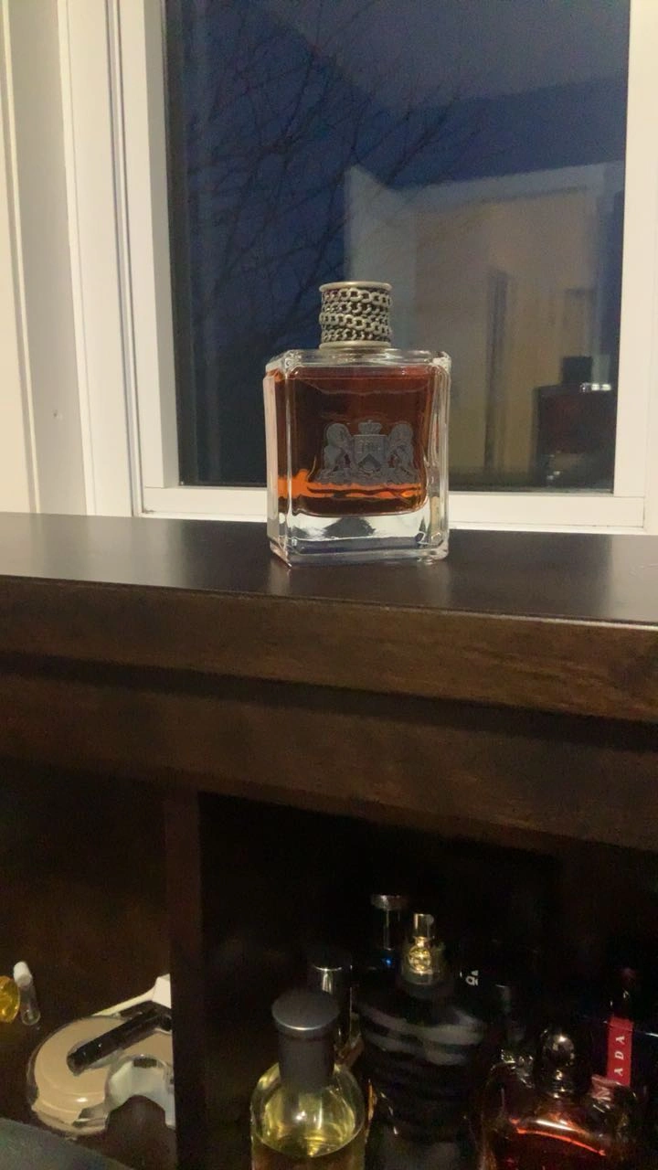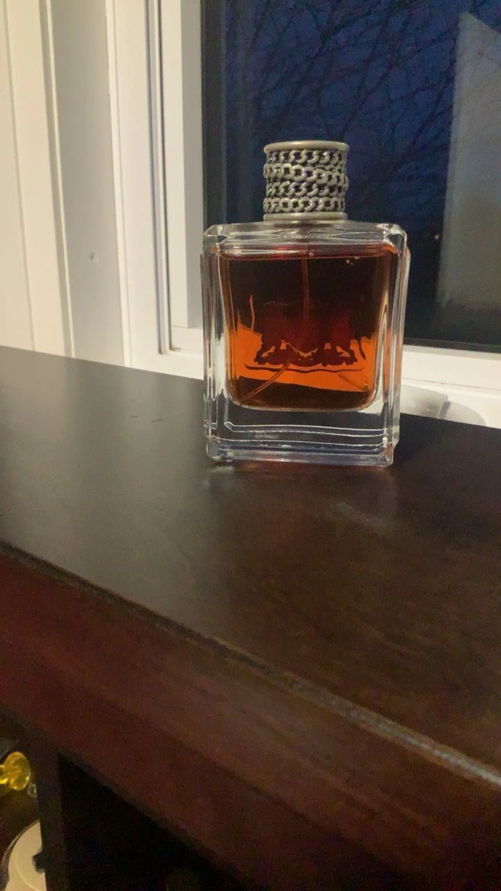 Men's fragrance. Square glass bottle. Metal chain detailing on cap. Amber coloured liquid. Unopened. I do not have the box for it sorry.