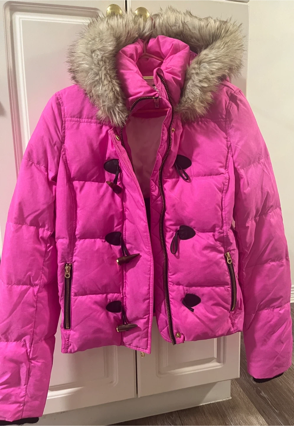 15Selling a cute Juicy Couture puffer jacket in a vibrant pink! It's a size small and features a fur-trimmed hood and toggle closures. Perfect for adding a pop of colour to your winter wardrobe!