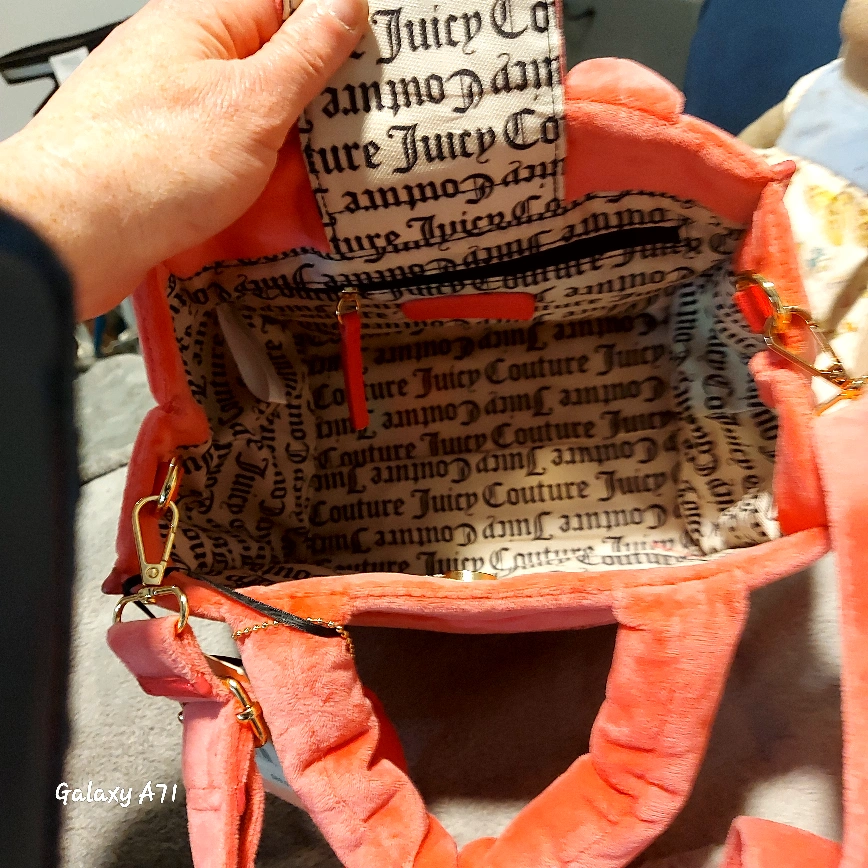 *"JUICY COUTURE"~PURSE. *FURRY(SHORT IN LENGTH, FURRY PINK PURSE). *BRAND NEW-NEVER USED. STILL HAS ALL ORIGINAL TAGS ETC ATTACHED. * LONG REMOVEABLE SHOULDER STRAP OR MAY INSTEAD USE AS A SIMPLE SHORT(ER) HANDLED HAND BAG. *JEWELED "JUICY COUTURE" BRAND NAME ACROSS ONE SIDE OF PURSE,(IN SMALL SILVER JEWELS. SEE iN PICS ABOVE). *PAID $89 + TXES (TAG'S STILL ON) & ASKING $38.