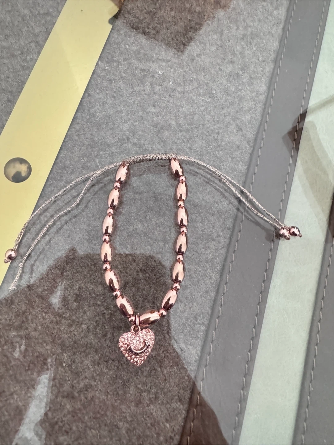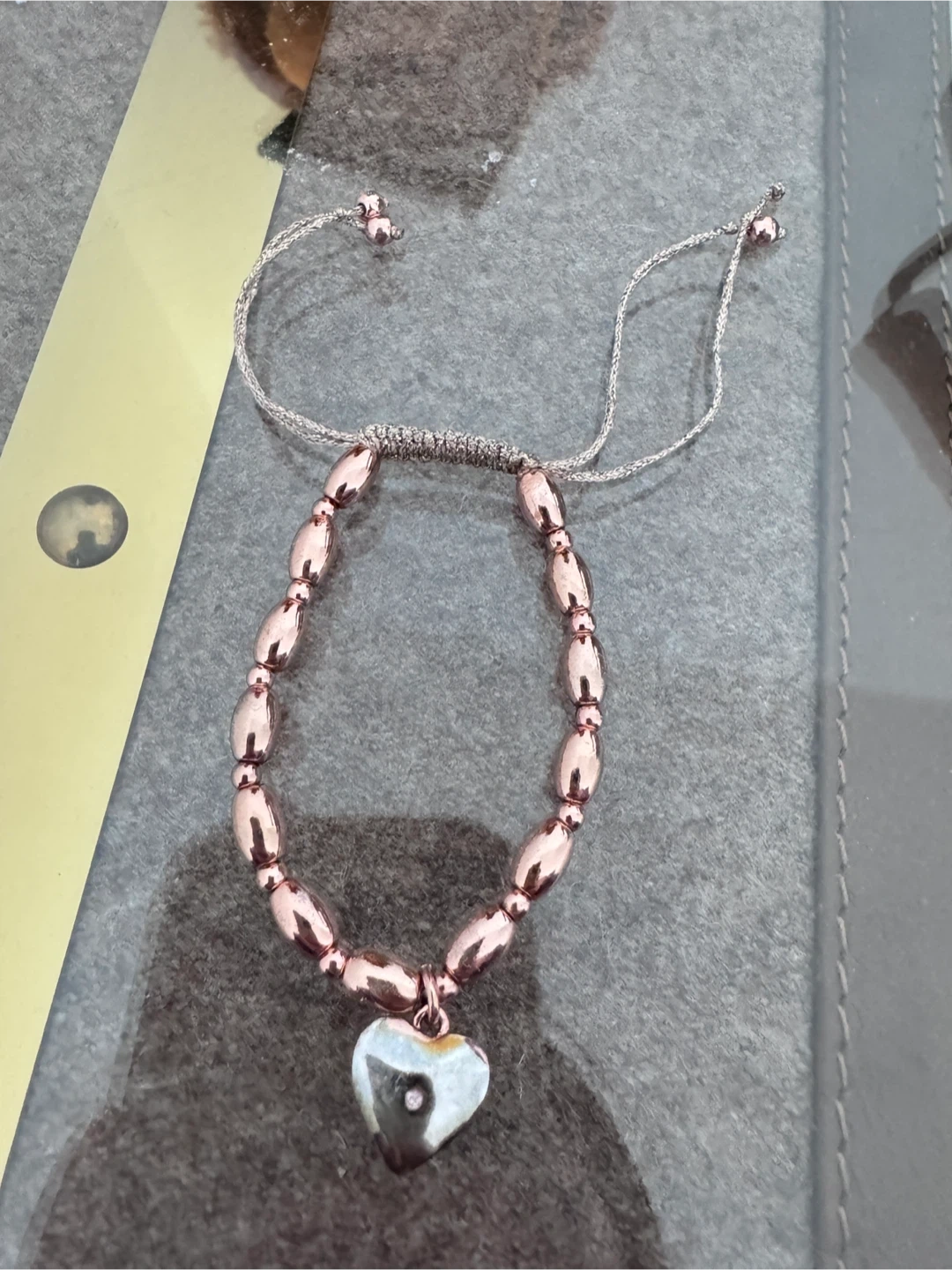 67This is a cute rose gold coloured bracelet with a heart charm. It features an adjustable macrame closure for a comfortable. Perfect for adding a touch of sparkle to any outfit! Pickup location: Hwy 7 and Bayview