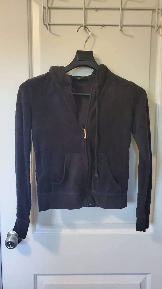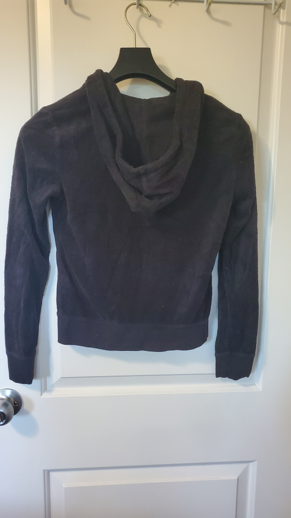 Black Terry cloth hoodie with a gold zipper and a small pocket on the front. Size XS. please ask about bundles on multiple items from my page!