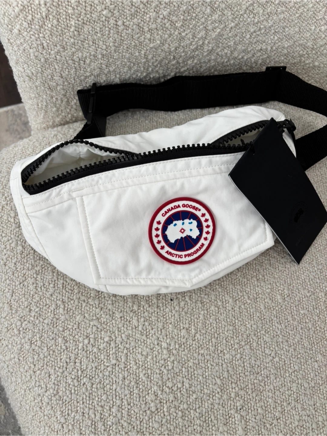 This Canada Goose waistpack is white with black stripe accents. It's a unisex, one-size fits all design. Perfect for carrying essentials on the go!