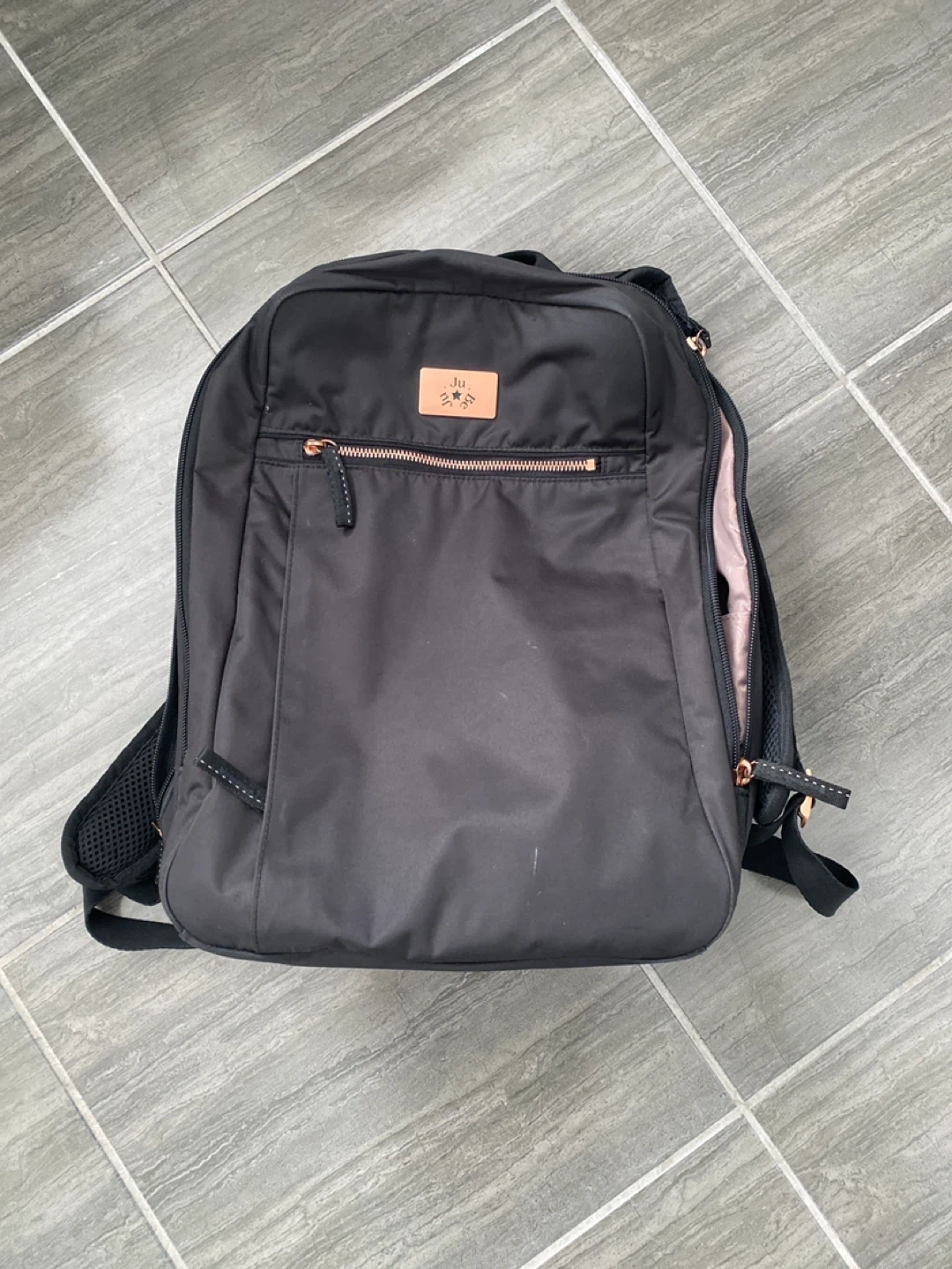 40A diaper bag in black with rose gold accents. It's in great condition, clean with functional zippers and straps. Interior has mesh compartments to organize baby items.