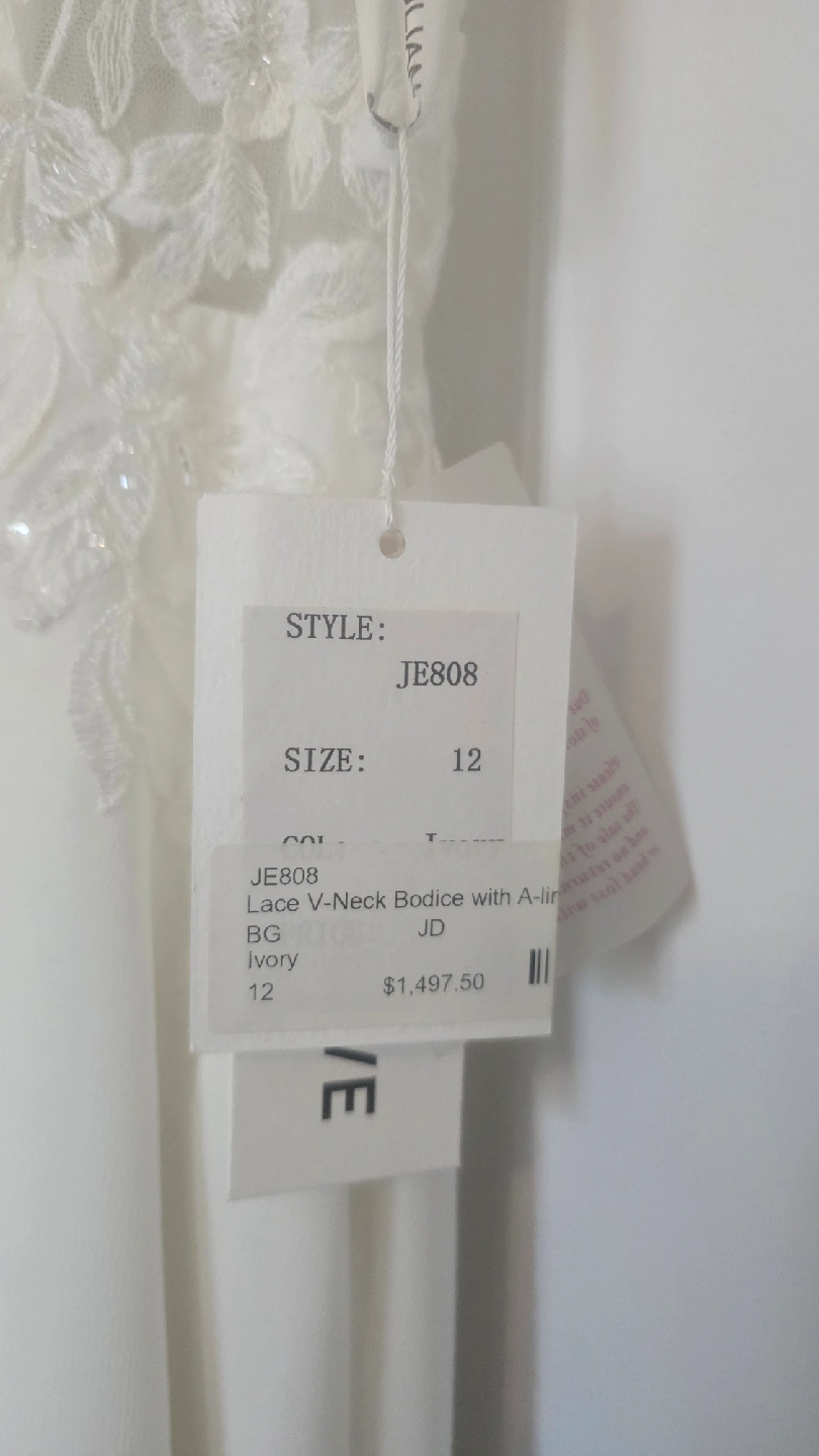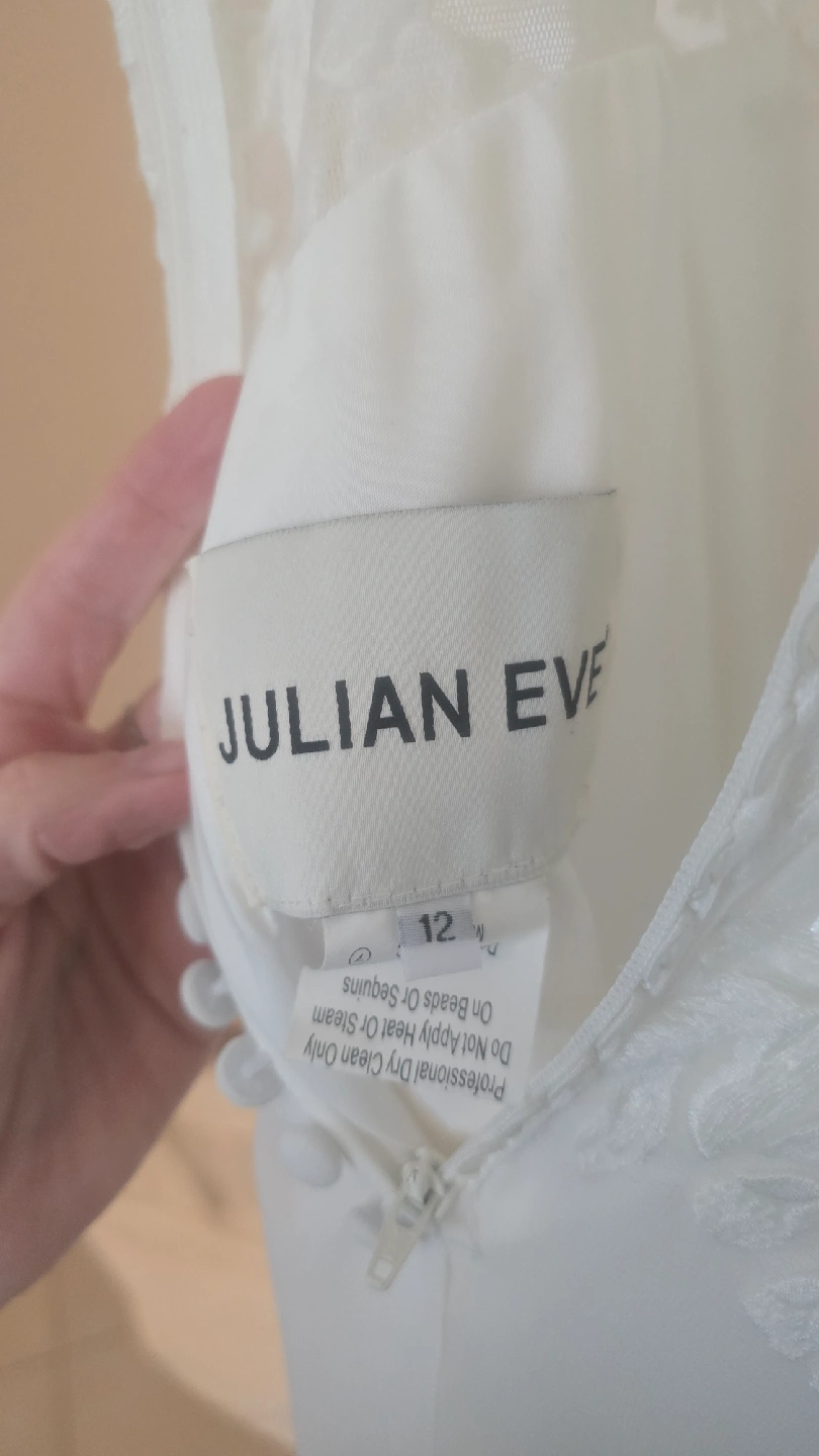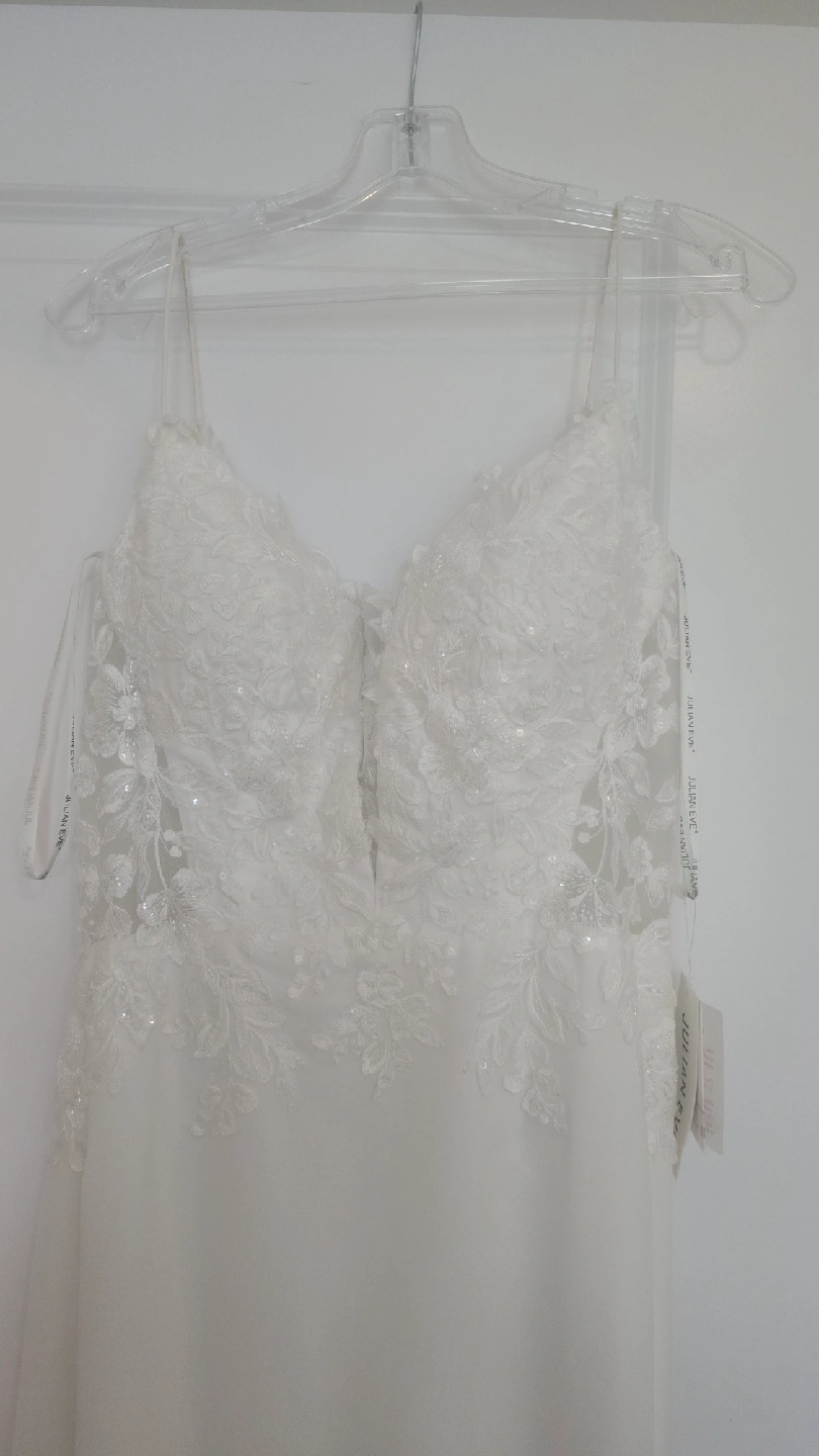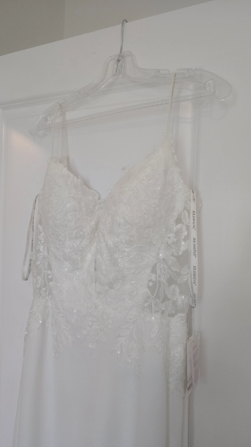 Julian Eve wedding dress, size 12, style Je808 Never worn (I purchased two and wore the other), but has had slight alterations. Shoulder straps shortened, hem made slightly shorter (I'm 5'7), lace added between bust (could easily be removed). Has not been dry cleaned after alterations but probably could use a clean prior wear. Straps and hem do show slight dust/soil from trying on and sitting at the tailors and should be cleaned, or straps could be easy replaced by a tailor. The dress is otherwise in perfect condition. Tags still attached, original price was $1497 + tax
