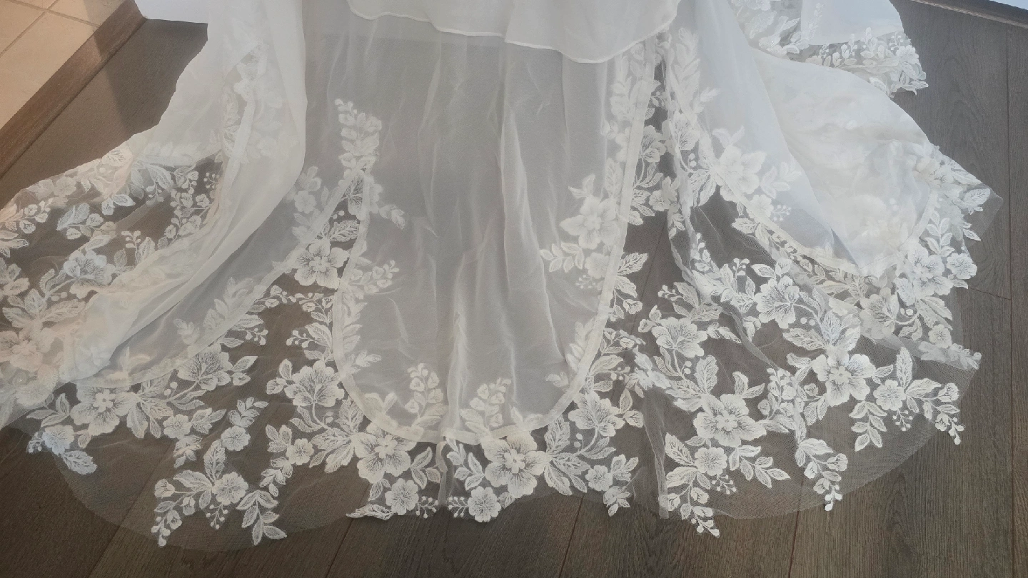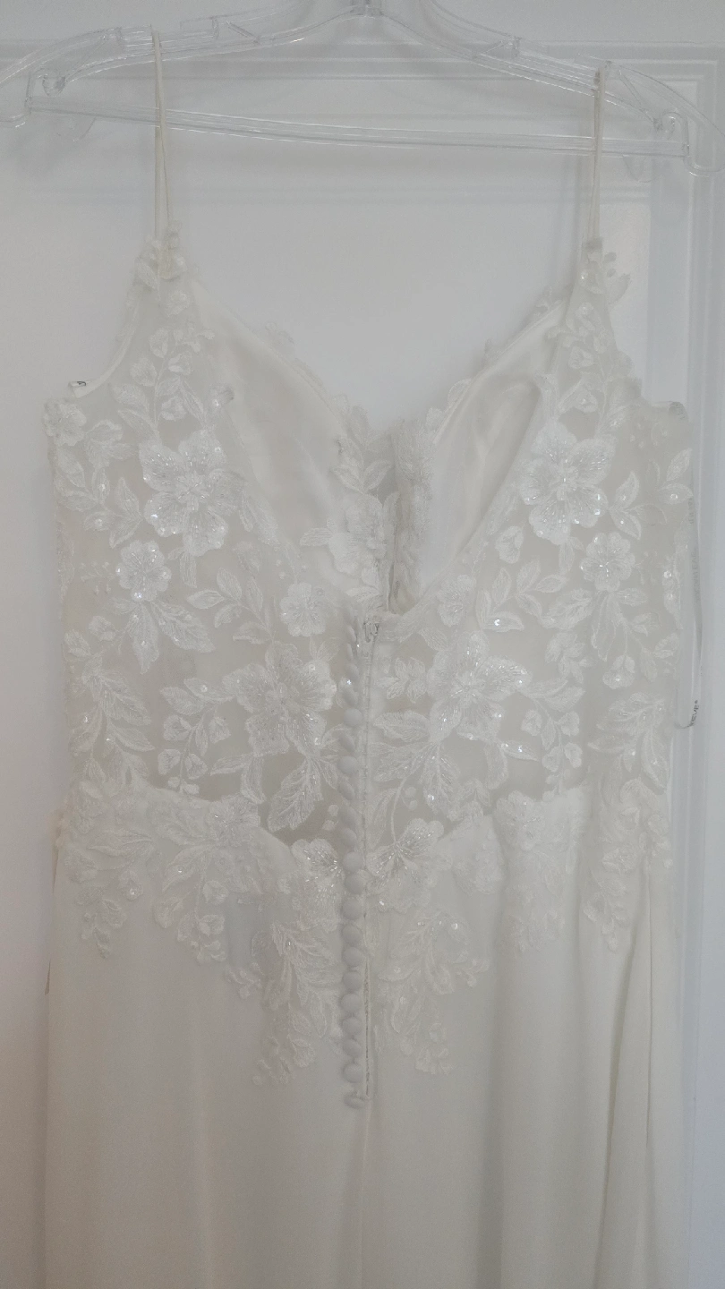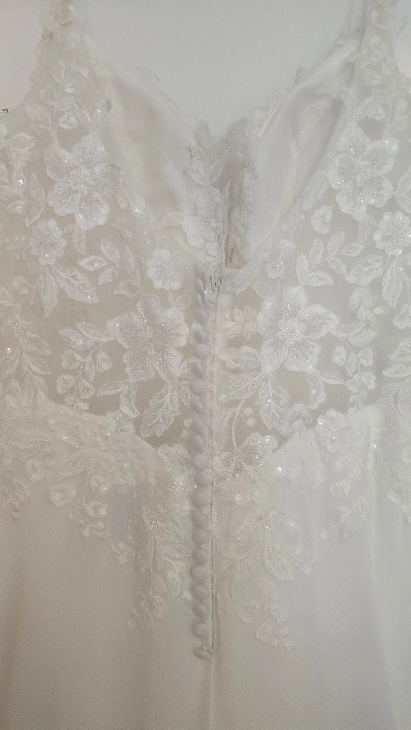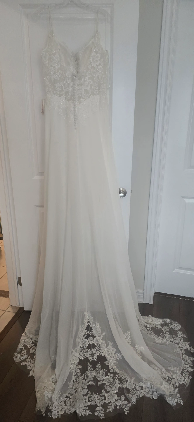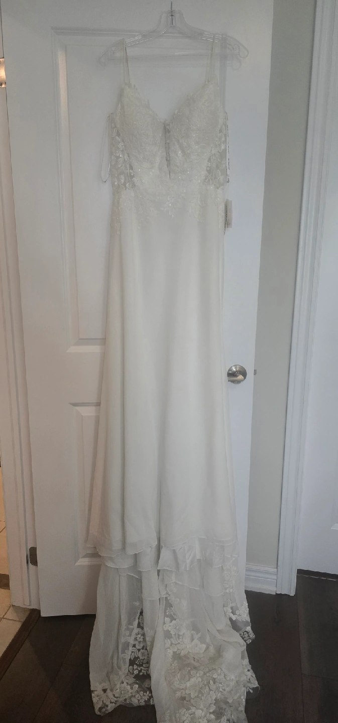 Julian Eve wedding dress, size 12, style Je808 Never worn (I purchased two and wore the other), but has had slight alterations. Shoulder straps shortened, hem made slightly shorter (I'm 5'7), lace added between bust (could easily be removed). Has not been dry cleaned after alterations but probably could use a clean prior wear. Straps and hem do show slight dust/soil from trying on and sitting at the tailors and should be cleaned, or straps could be easy replaced by a tailor. The dress is otherwise in perfect condition. Tags still attached, original price was $1497 + tax