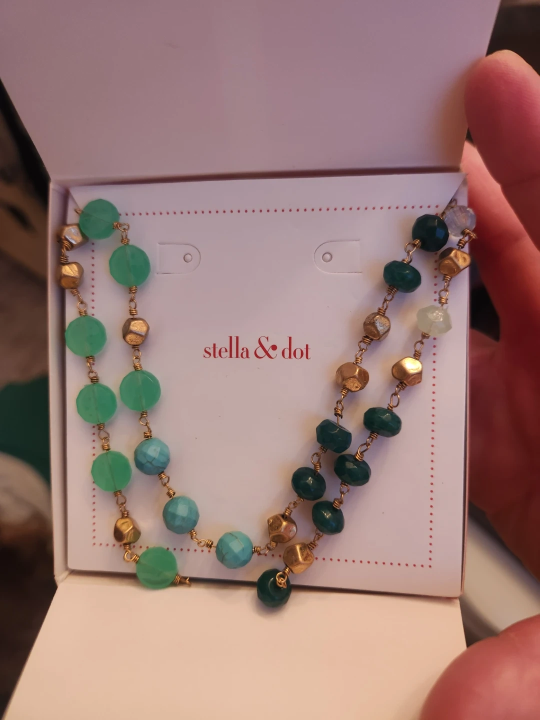 Stella & Dot necklace with green and blue beads accented with gold-tone hardware. Natural variations are visible in each stone making it unique! It's a beautiful multi-strand piece.