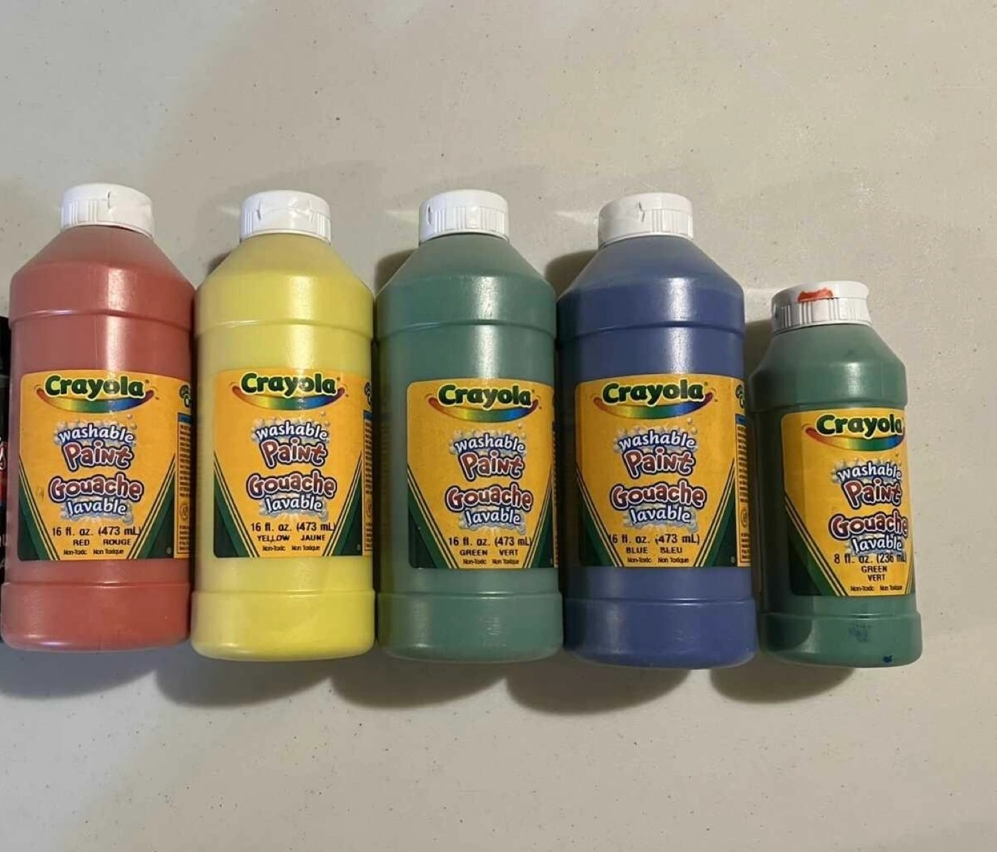 $15 for bundle of 5. Jumbo size - 16 oz bottles and one 8 oz bottle of Crayola washable gouache paint. Colours include red, yellow, green, blue, and dark green.