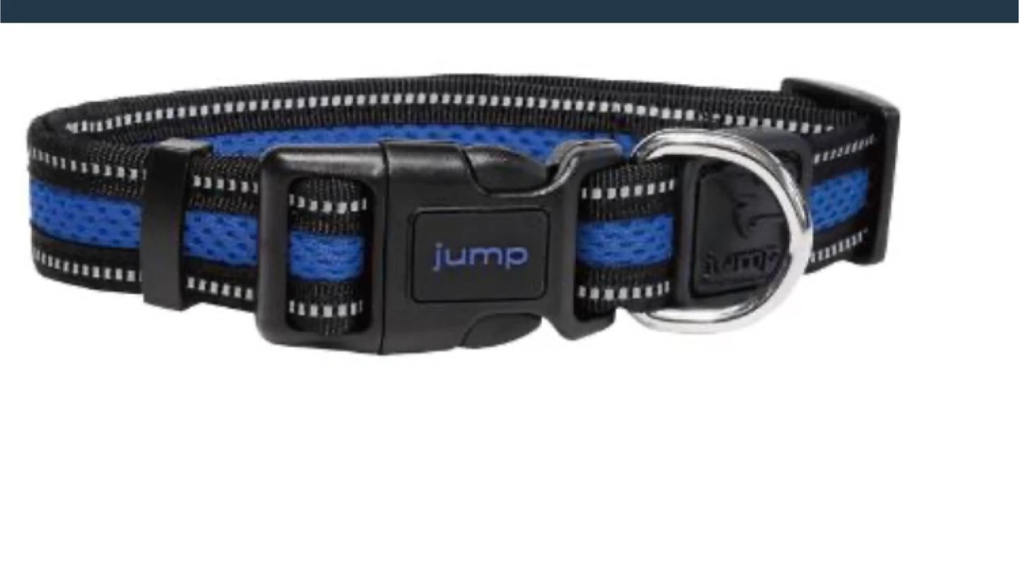 146This is a Jump Mesh Blue Dog Collar in size small (12-18”) . It features reflective stitching and is made with lightweight and durable high-quality air mesh. It's easy to put on and take off, with a durable side-release buckle and an adjustable tri-glide system for a custom fit. Originally bought for $19.99