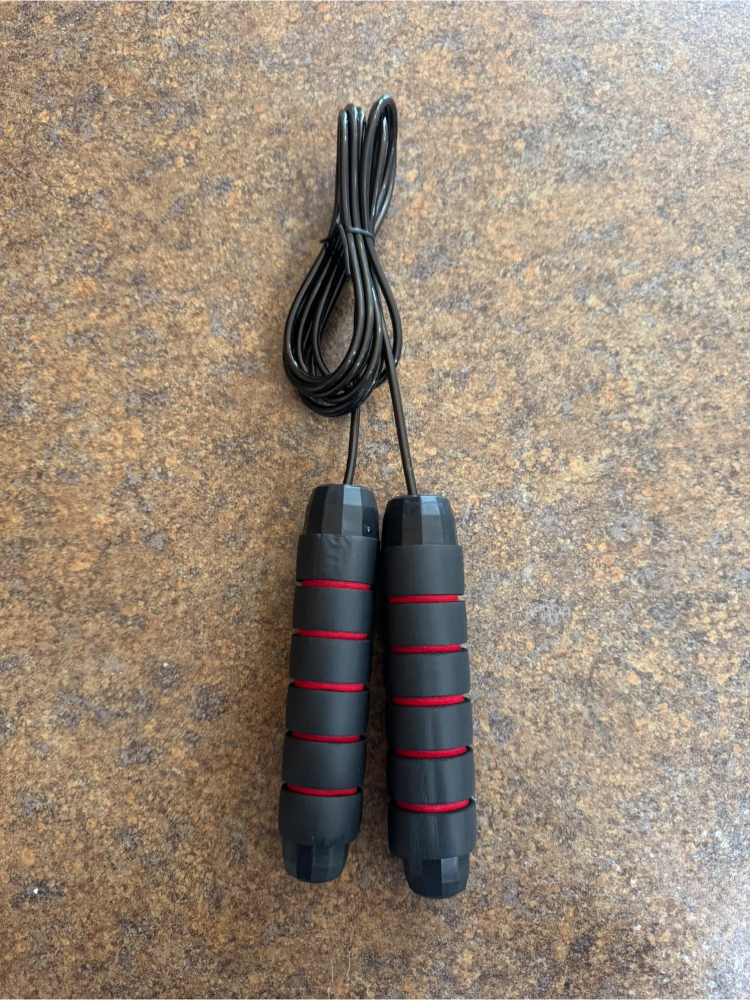 Get your cardio in with this jump rope! It has comfortable black handles with red accents. Perfect for a quick workout at home or on the go.