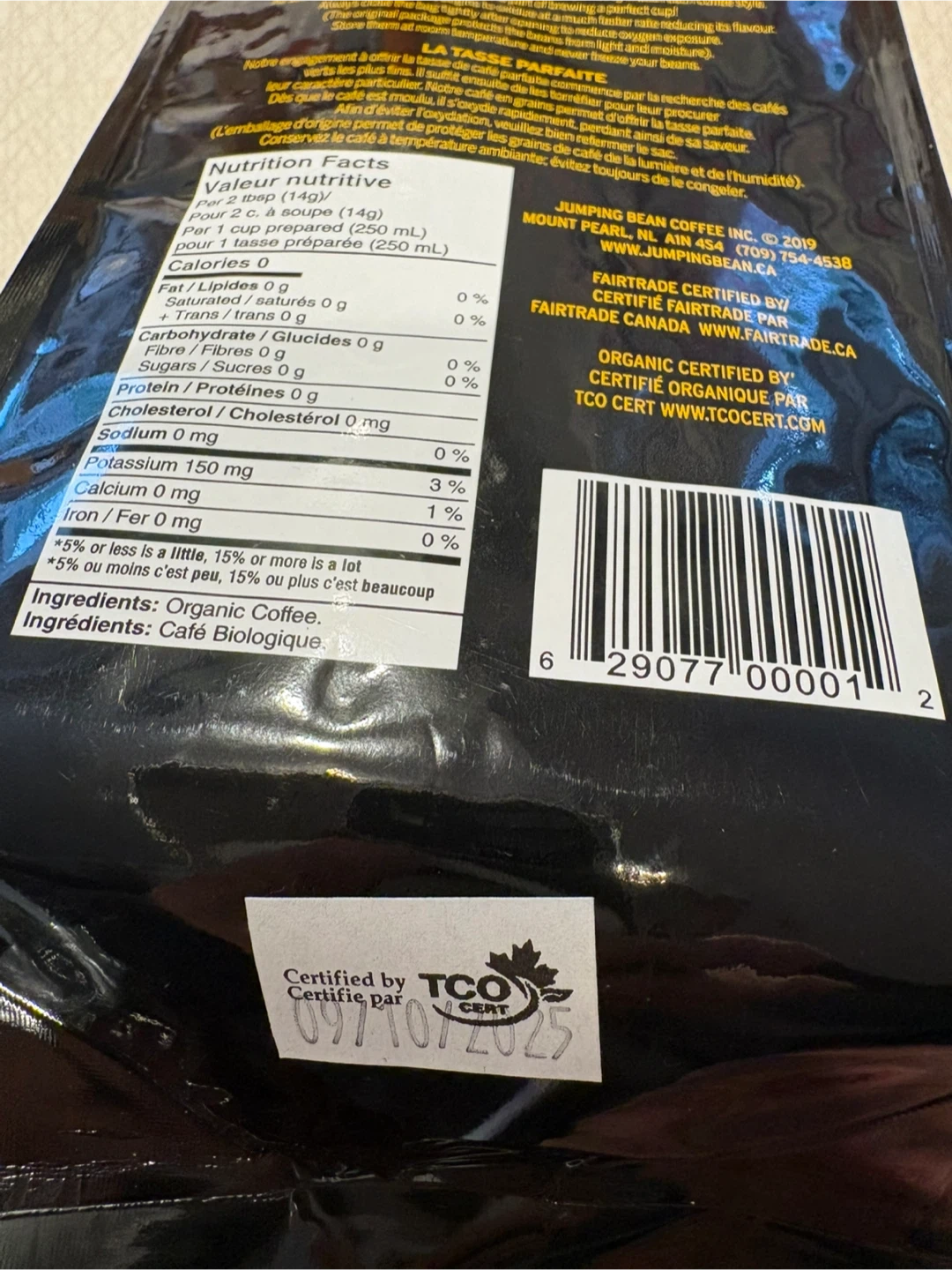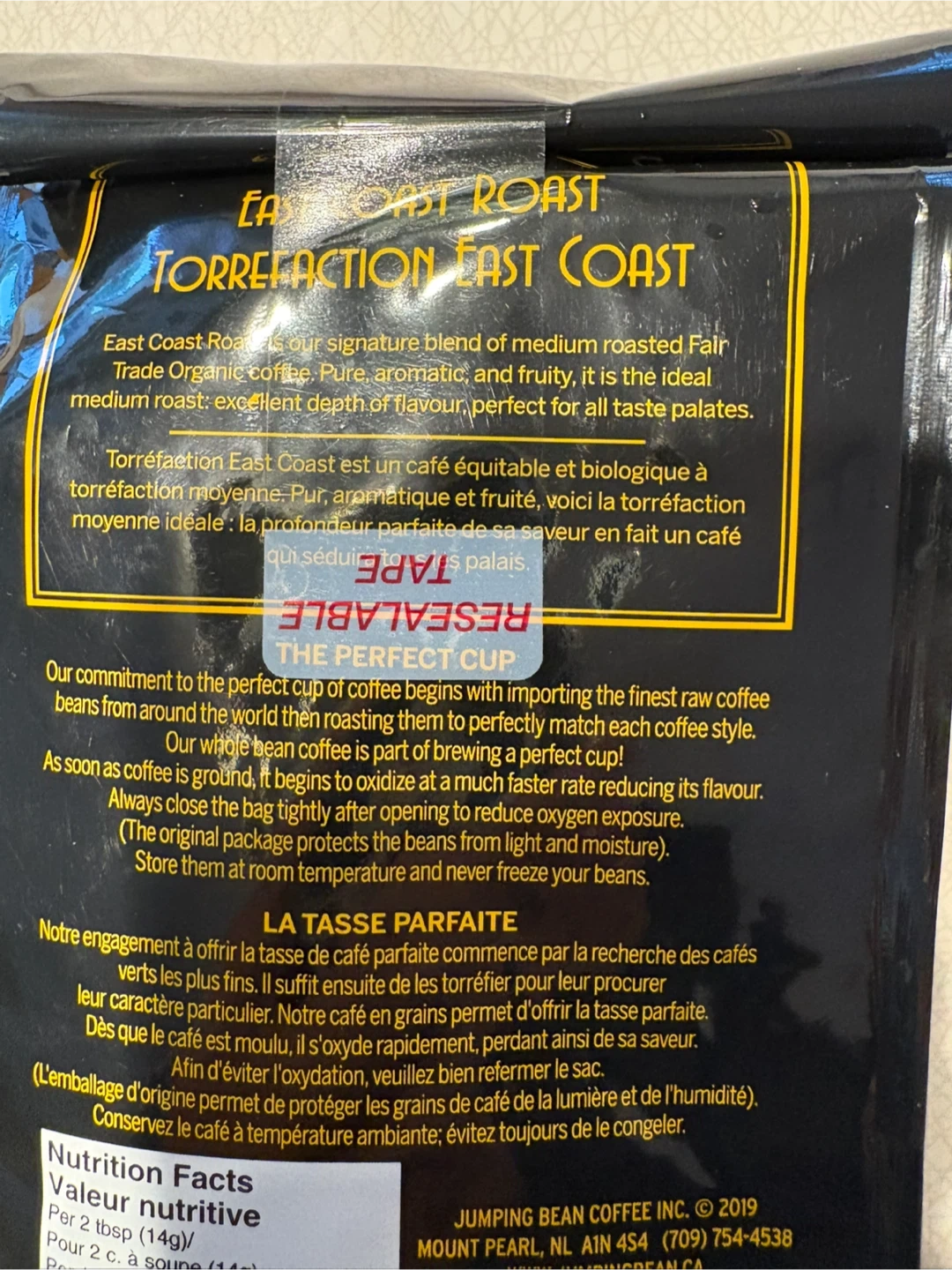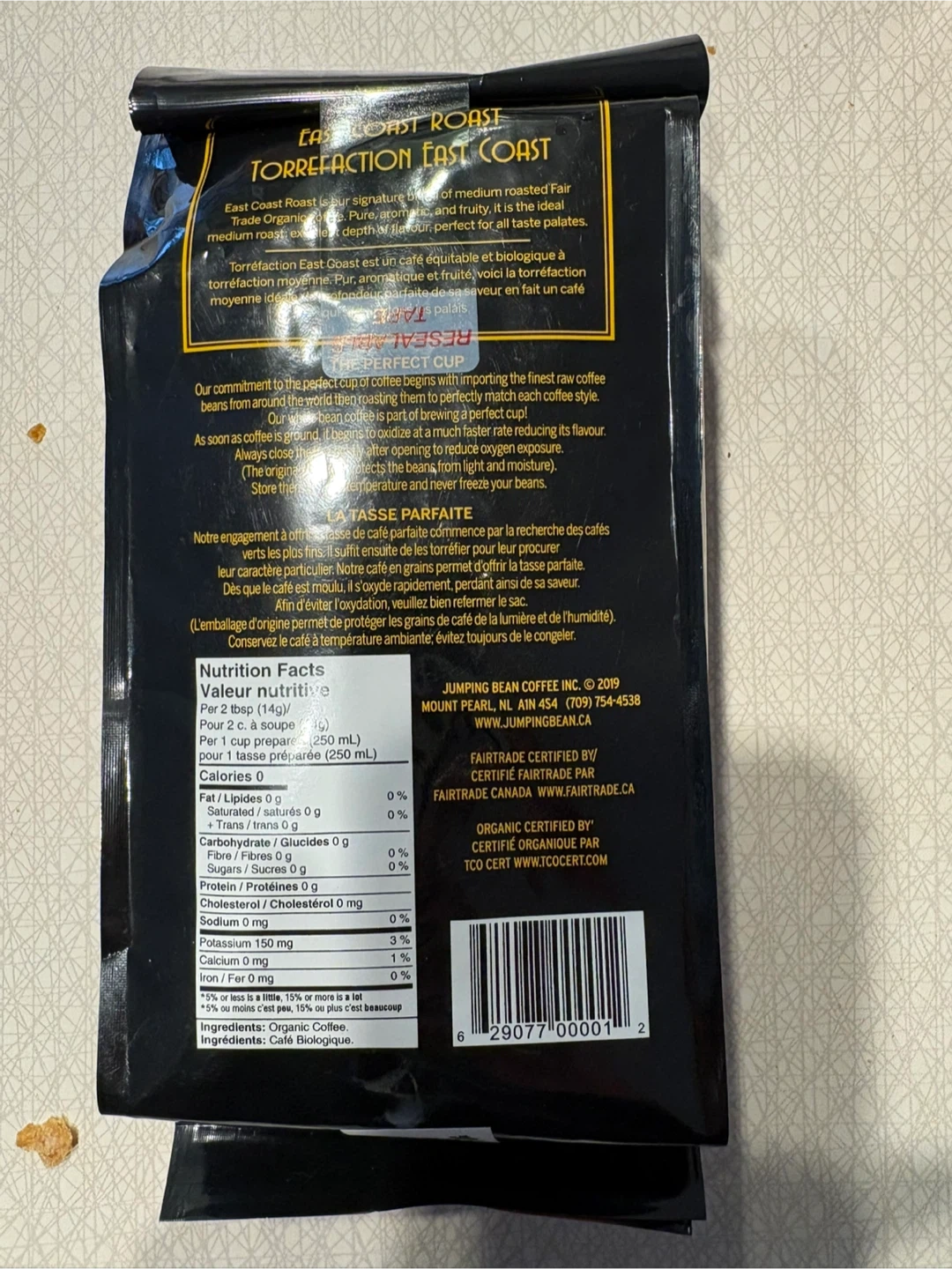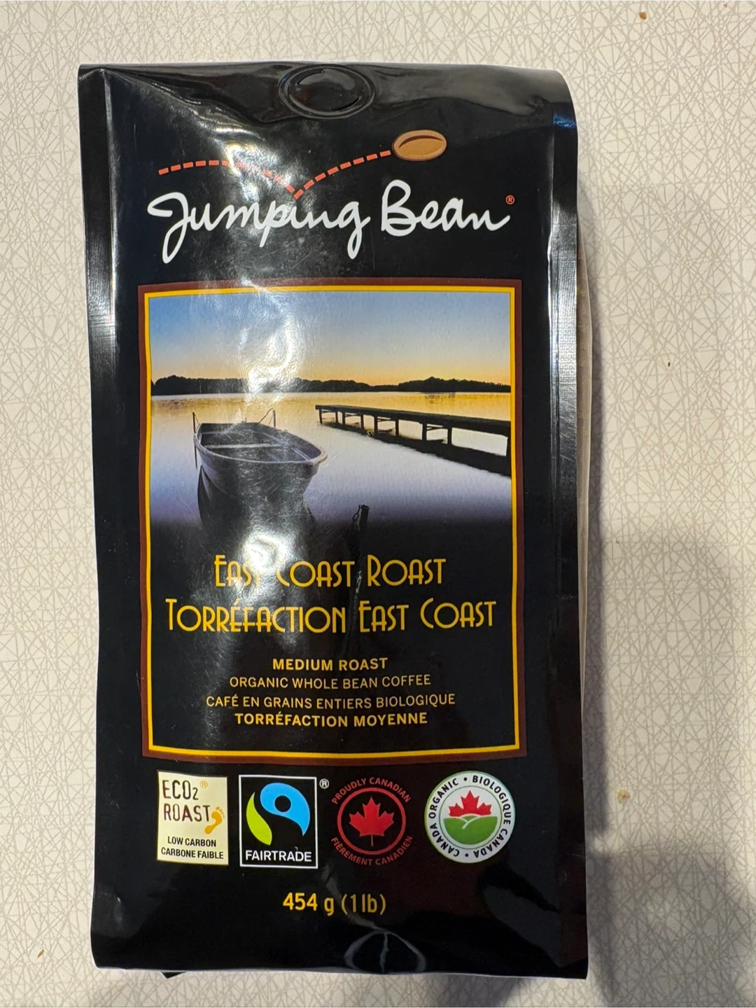 Selling a bag of Jumping Bean East Coast Roast coffee! It's a medium roast, organic whole bean coffee. Pick up at Morley trail NW