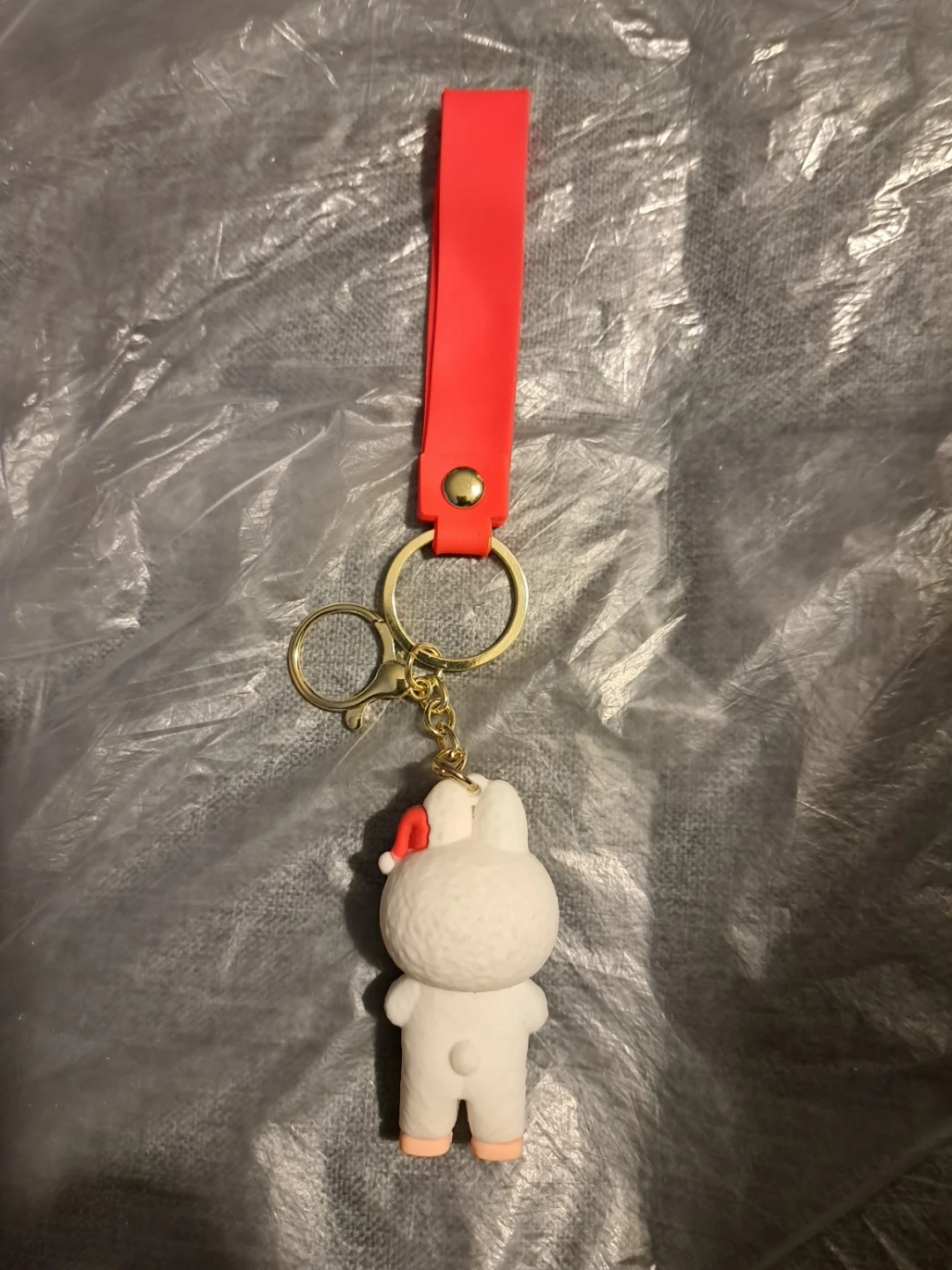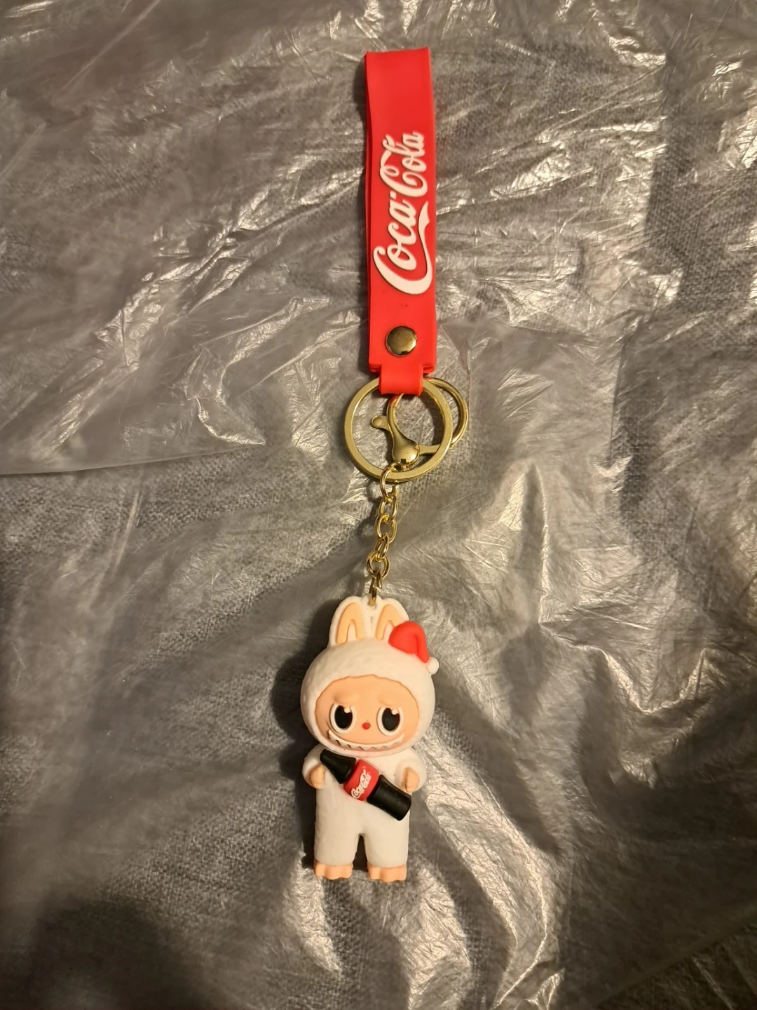 Here's a cute Coca-Cola keychain featuring a Labubu figure! It has a red strap with the Coca-Cola logo on it and a gold-tone keyring. Perfect for adding some charm to your keys or bag.