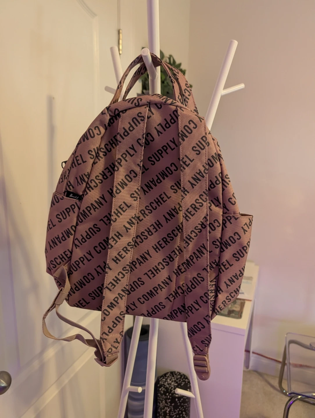This Herschel backpack comes in a pretty rose colour with the Herschel Supply Co. logo printed all over. It's a cute and practical bag for everyday use!