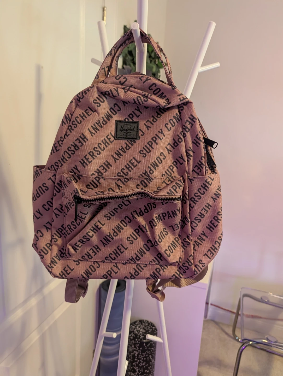 This Herschel backpack comes in a pretty rose colour with the Herschel Supply Co. logo printed all over. It's a cute and practical bag for everyday use!
