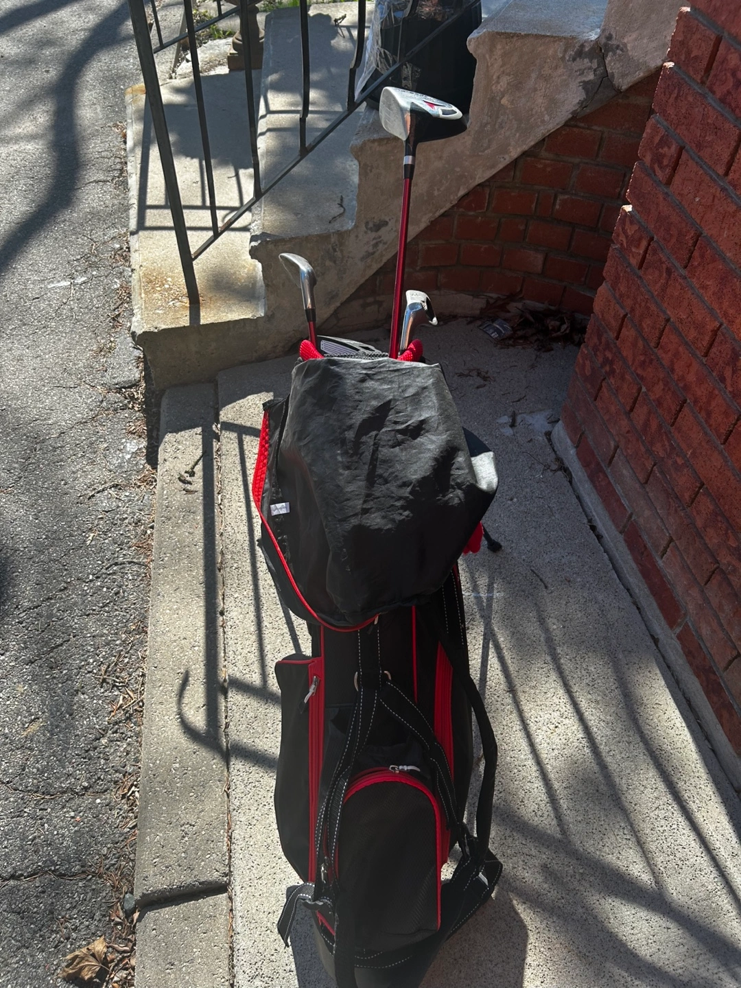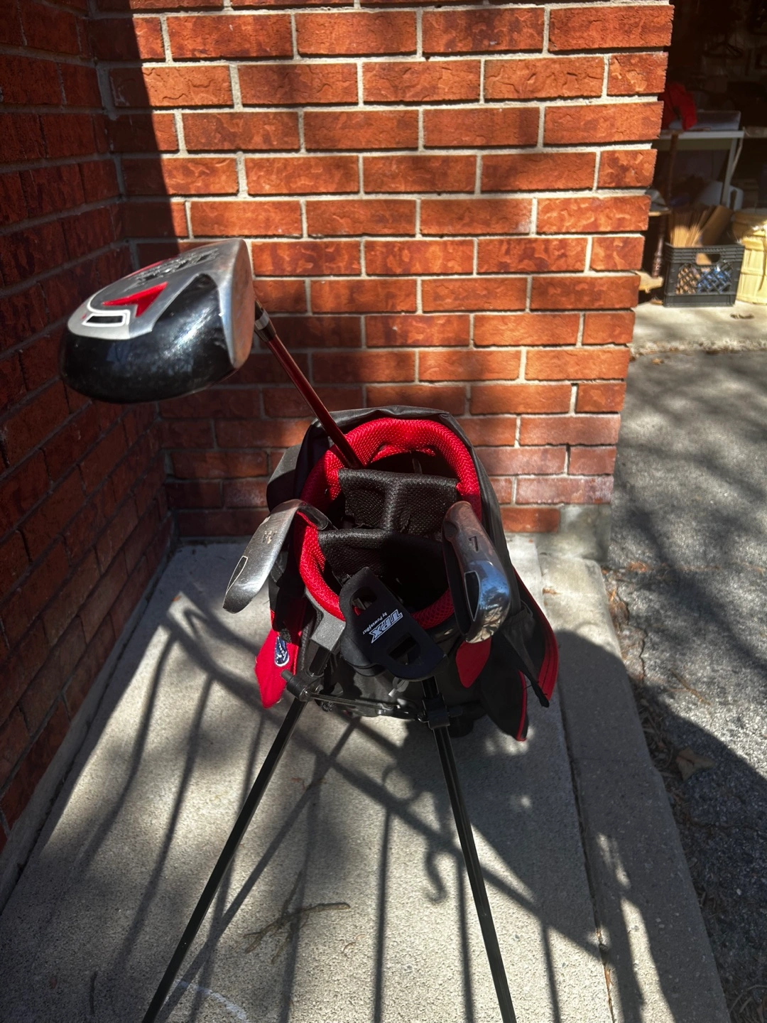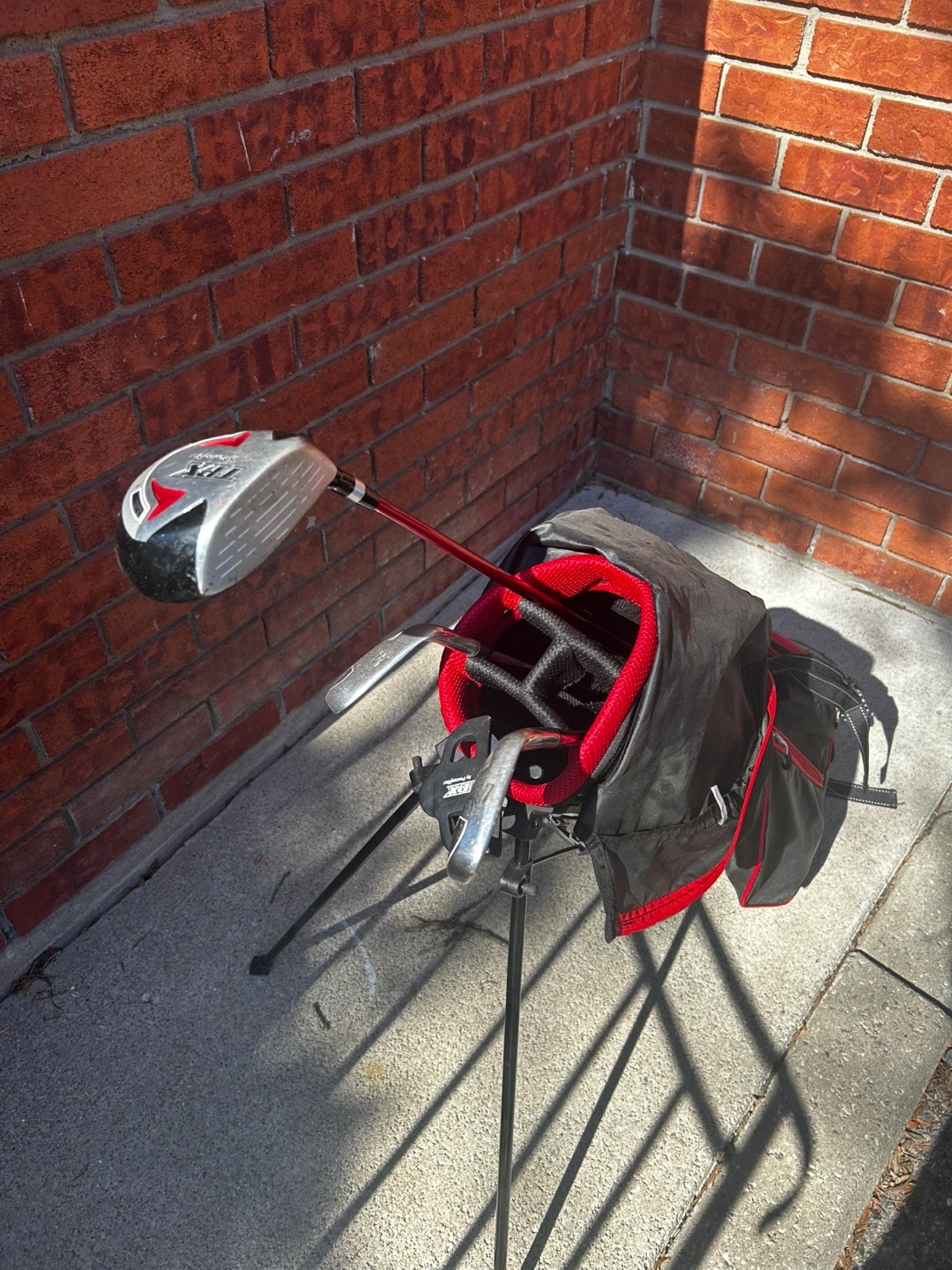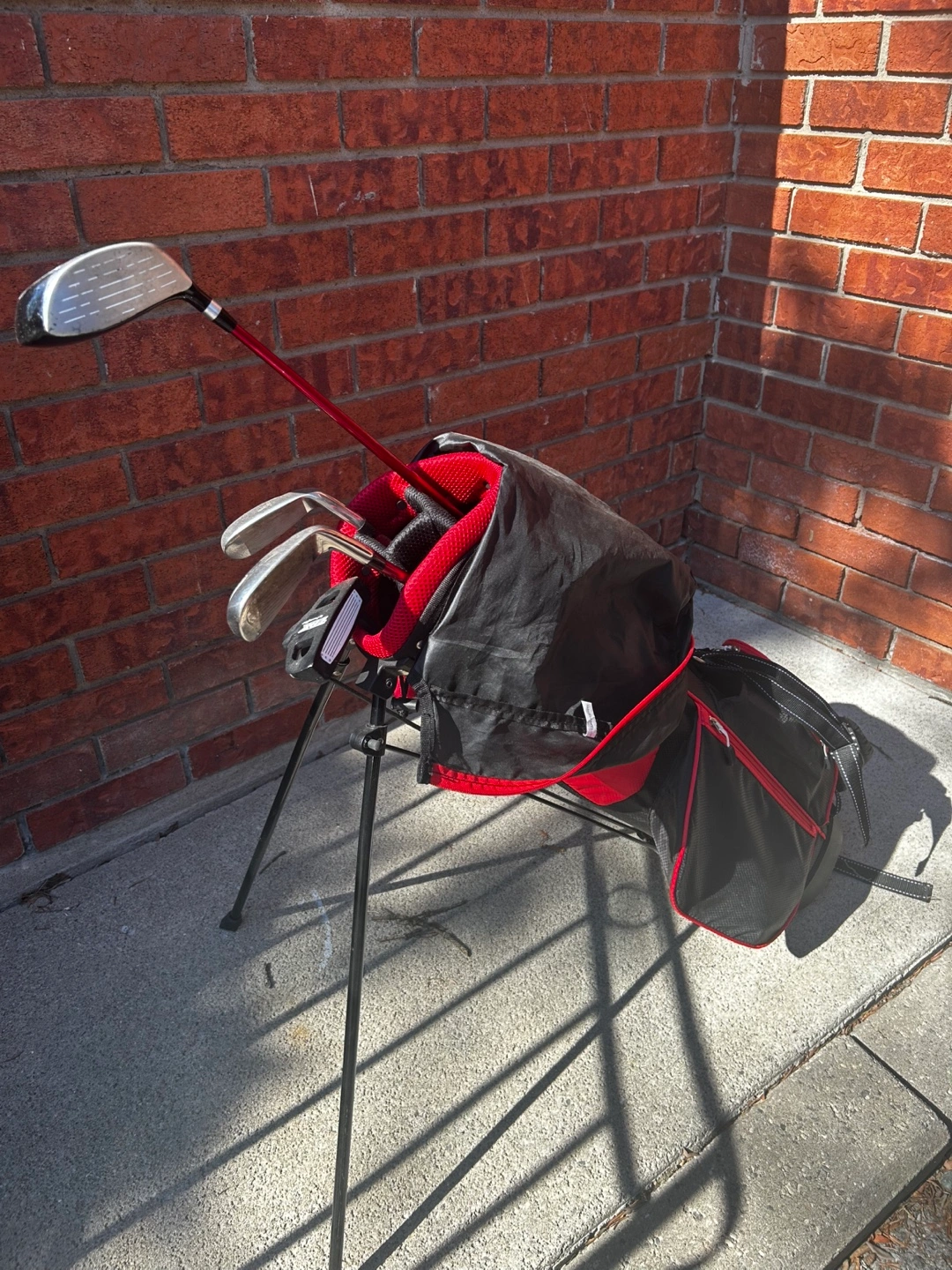 13Complete junior golf club set. Includes driver, irons, 7 iron as well and putter. Black and red stand bag. Great for young golfers. With bag