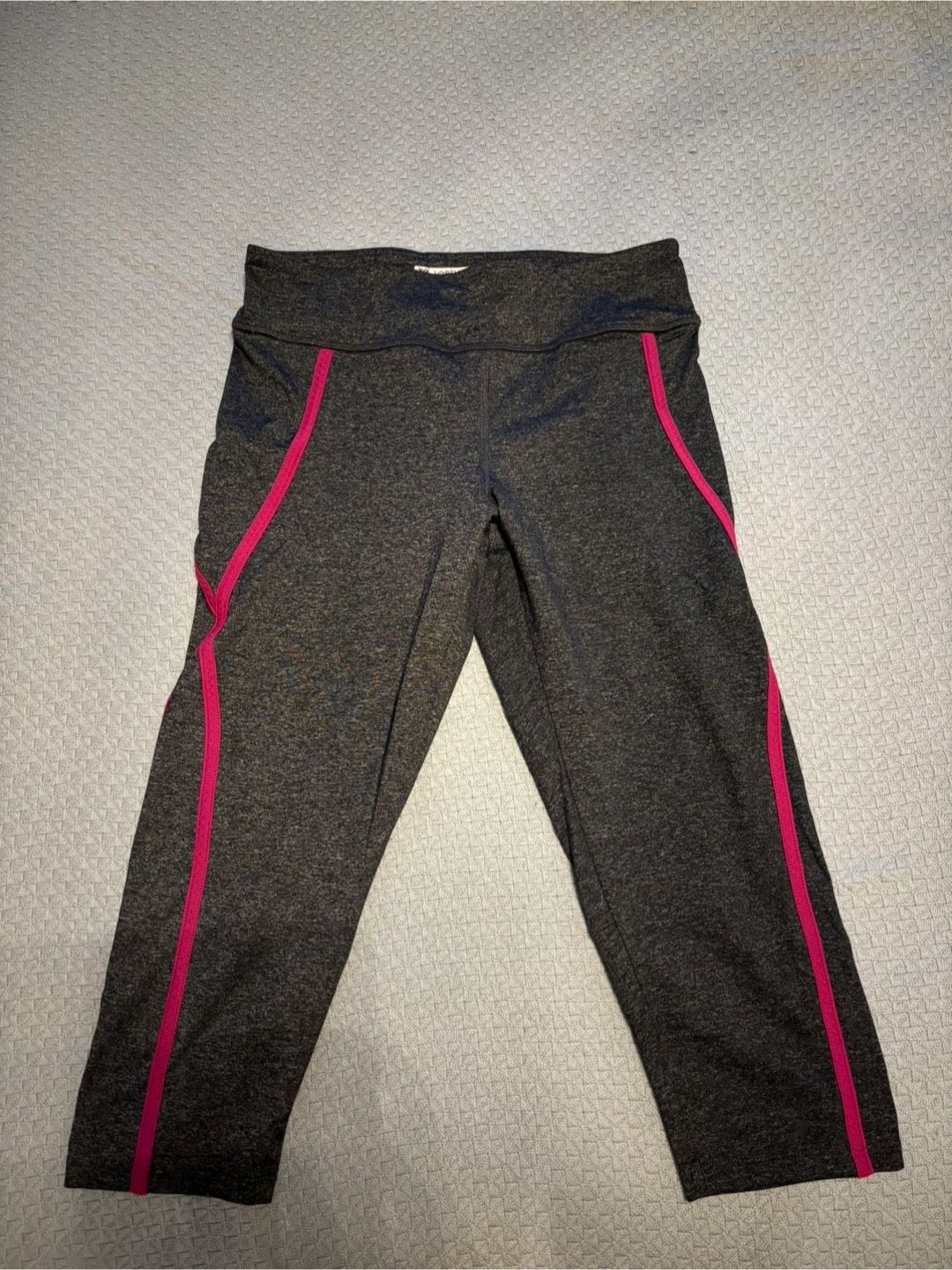 Selling a pair of capri-length leggings in a heathered grey colour. They feature a sporty pink stripe down the side. Perfect for workouts or casual wear!