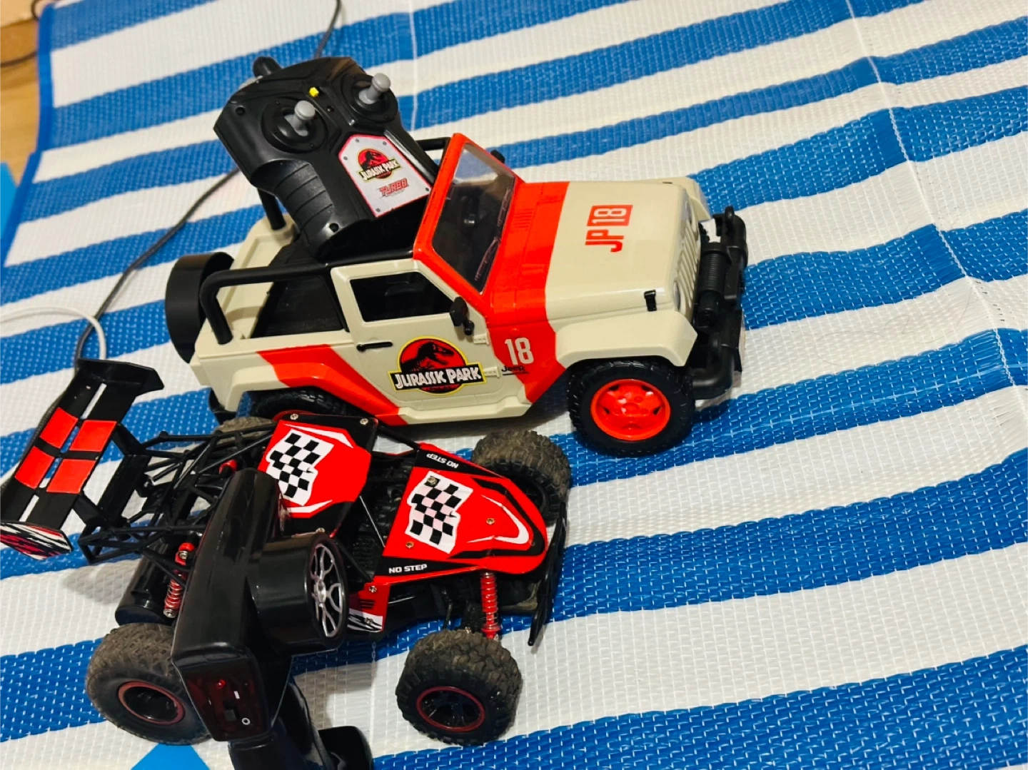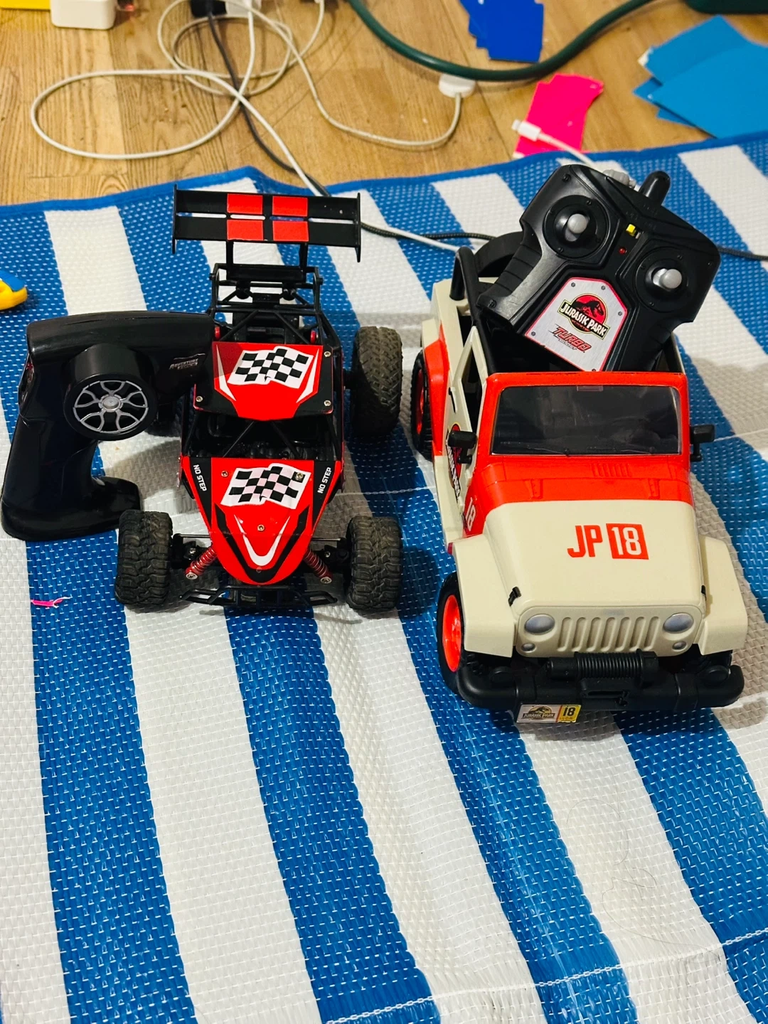 10Two RC cars for sale! One is a Jurassic Park jeep and the other is a No Step buggy. Both come with their respective remote controls. They're in good condition and ready for some off-road fun!