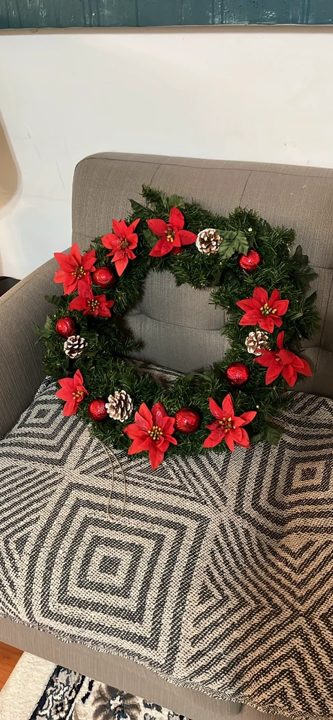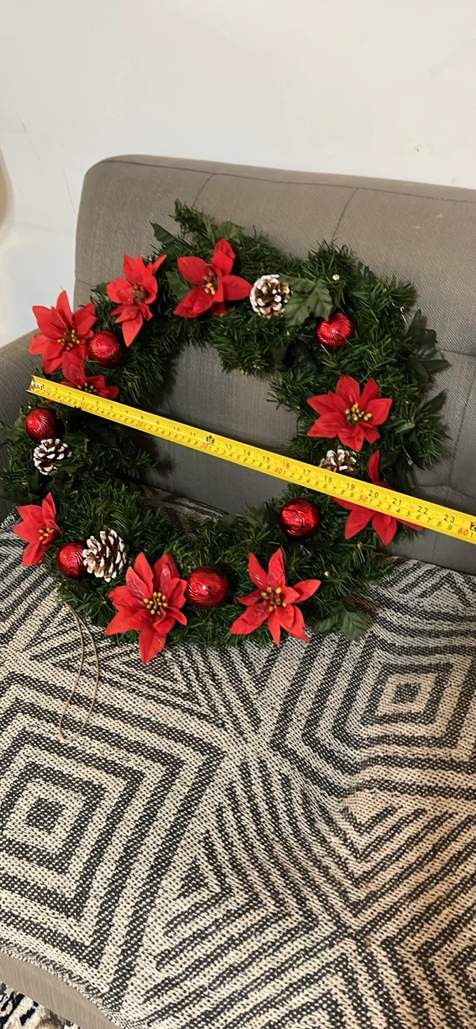 A festive Christmas wreath ready to brighten up your home for the holidays! It's decorated with red poinsettias, pine cones, and shiny red ornaments. The wreath measures approximately 20 inches in diameter.