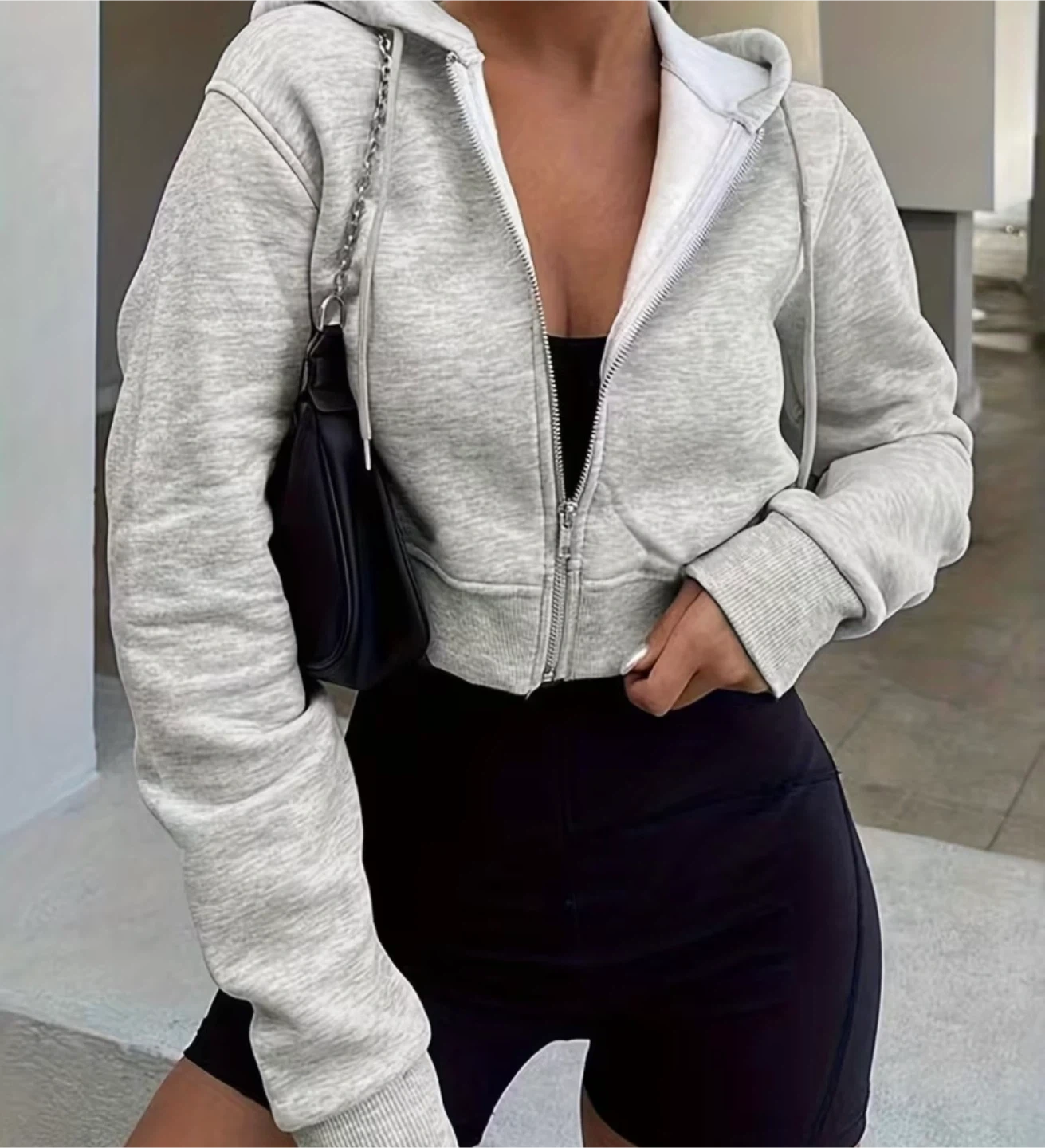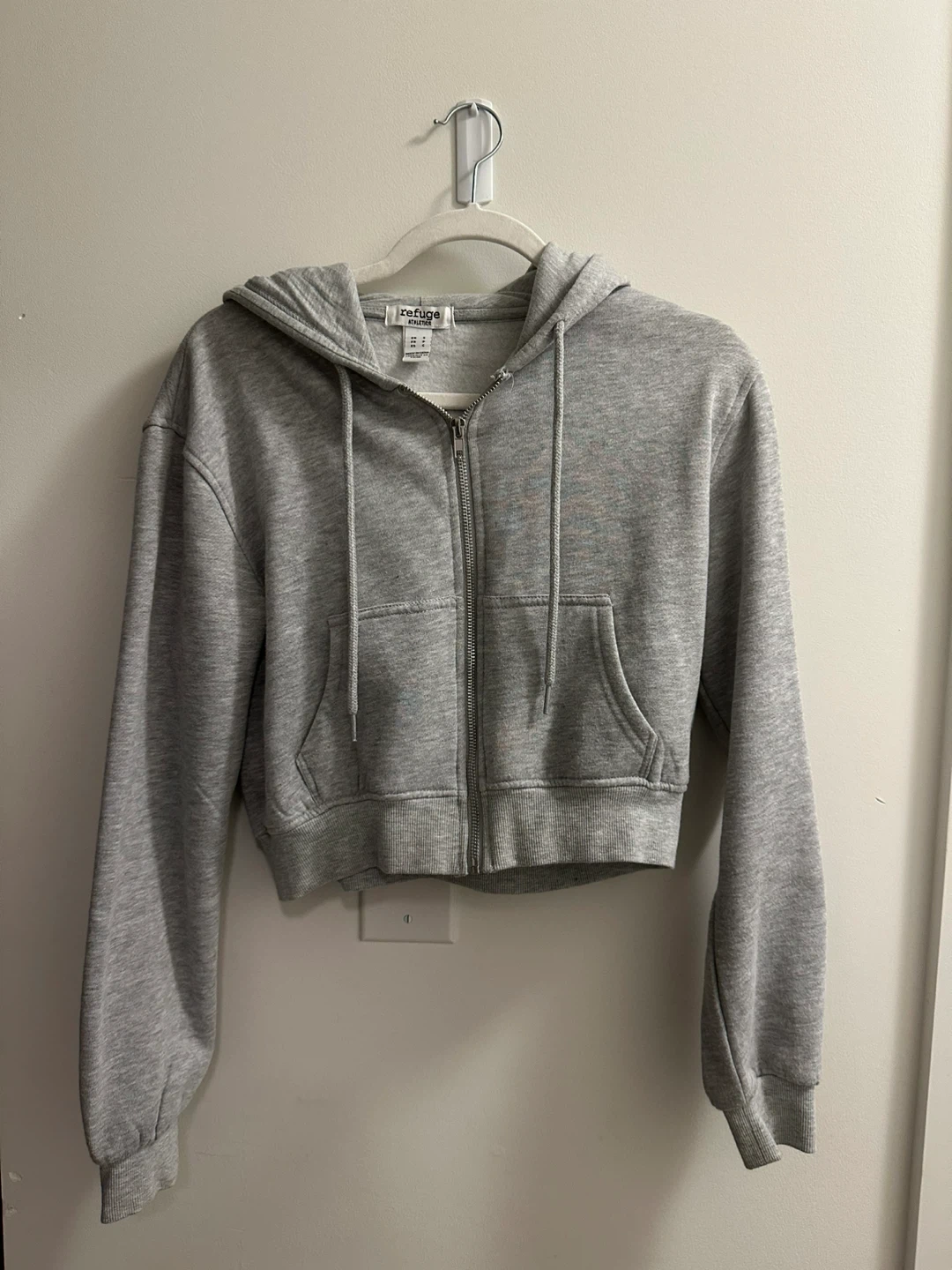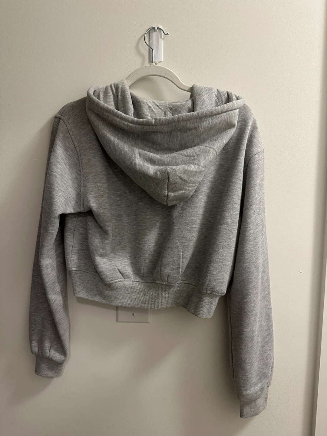 Similar to the pictures shown, this is a very cute cropped grey zip up hoodie perfect for cute outfits. Can dress up or down.