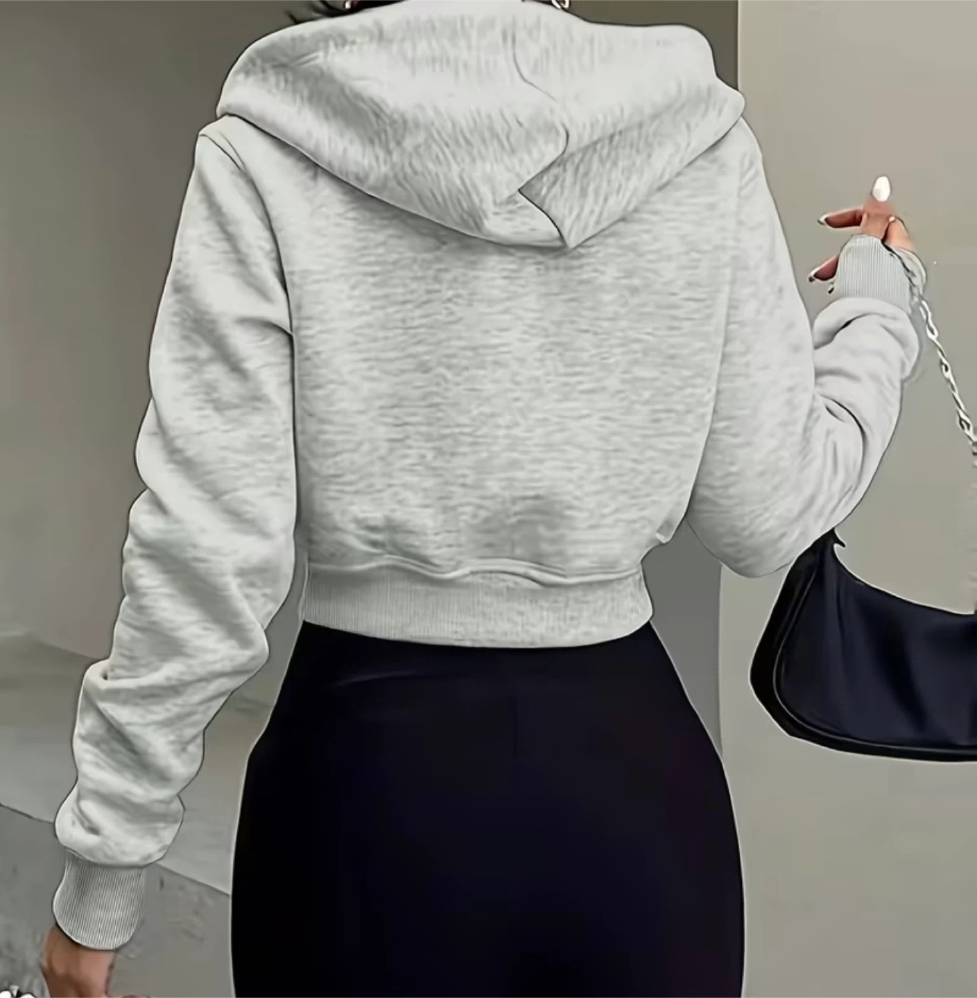 Similar to the pictures shown, this is a very cute cropped grey zip up hoodie perfect for cute outfits. Can dress up or down.