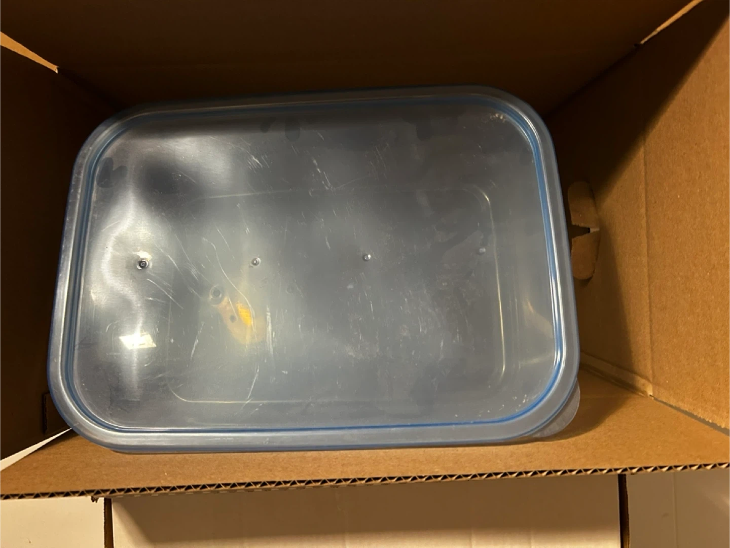 Plastic food storage container with a blue lid. It's made of clear plastic and is rectangular.