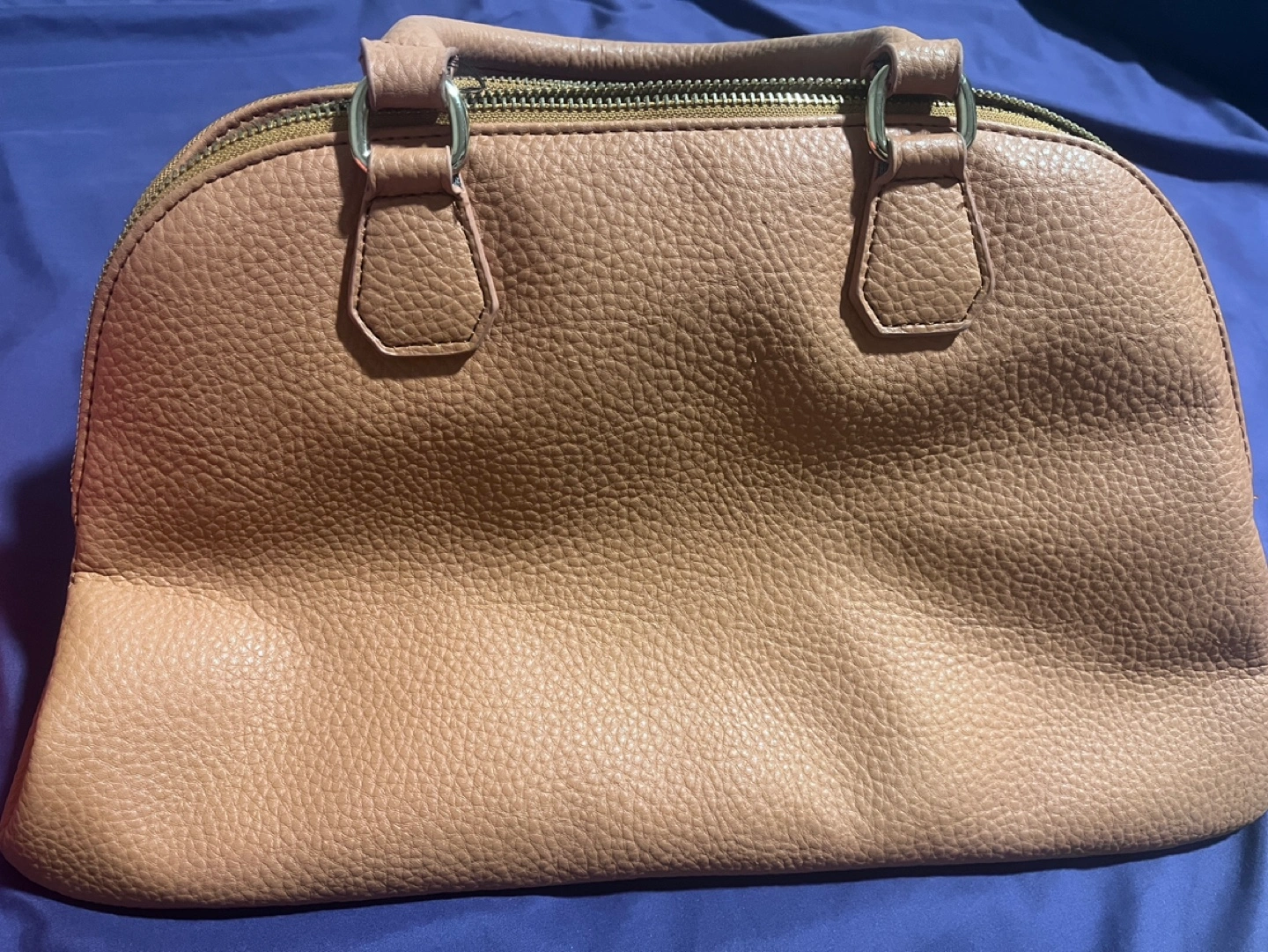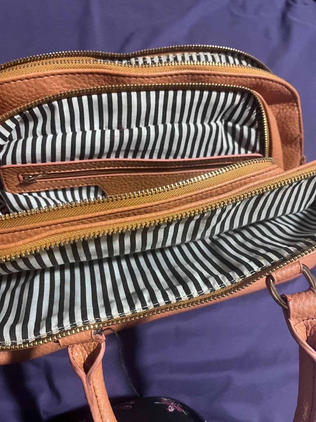 Adorable tan-coloured handbag. Triple zipper closure. Interior features black and white striped lining and zippered pocket. Two top handles. Great for everyday use.
