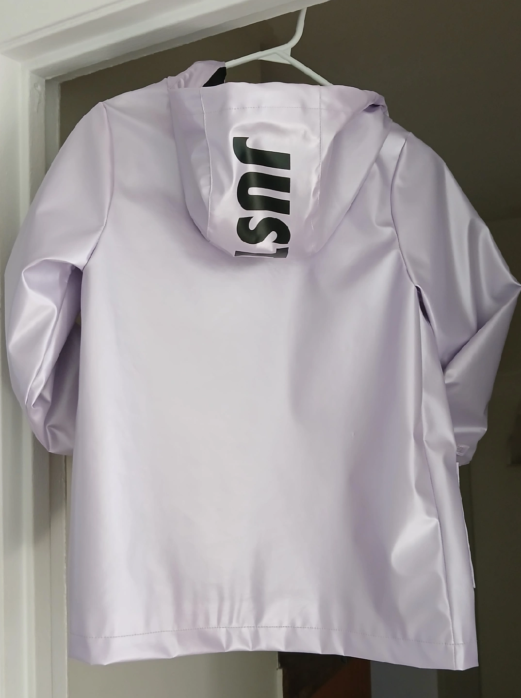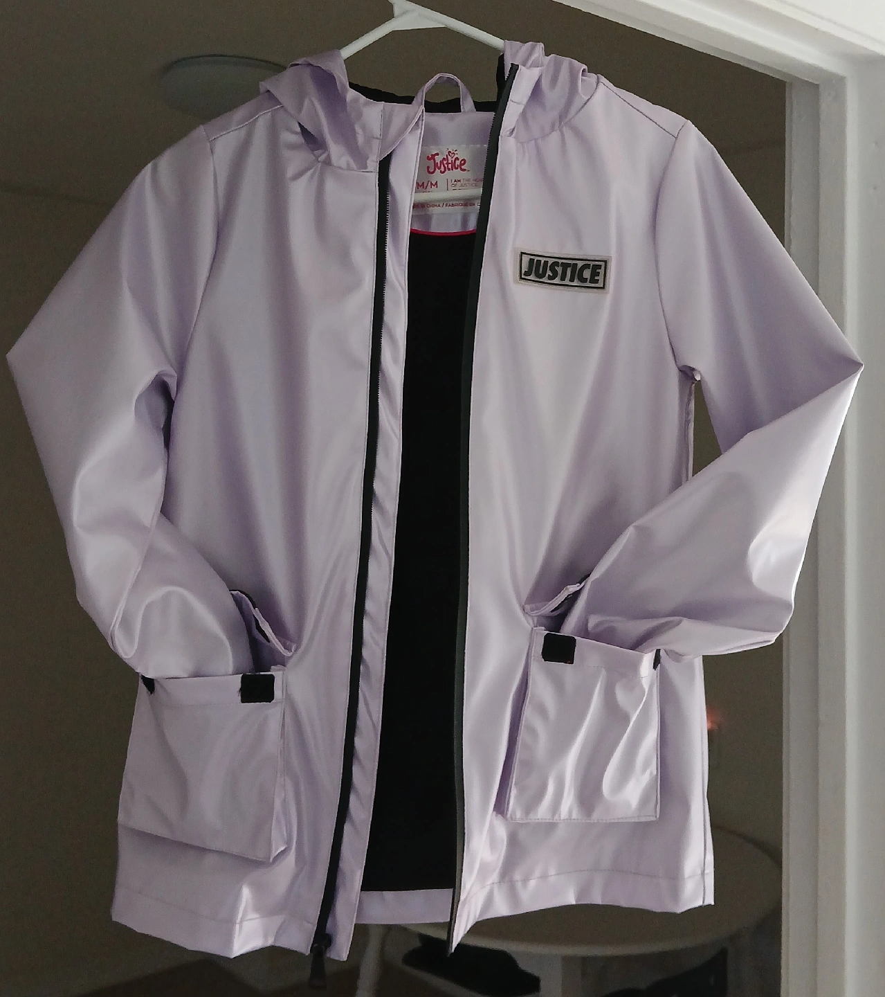 Selling a Justice purple rain jacket in size M/M. It's in great condition and perfect for those rainy days! The jacket features a hood with "JUSTICE" printed on the back and a logo patch on the front. It also has functional pockets.