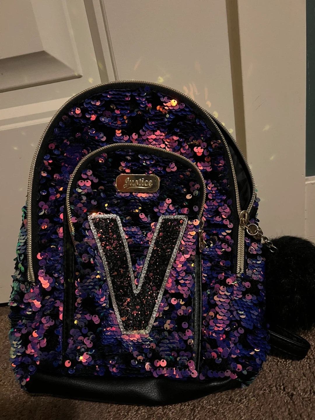15Justice sequin backpack with the initial V. It's in great condition and perfect for adding some sparkle to your day! ๐