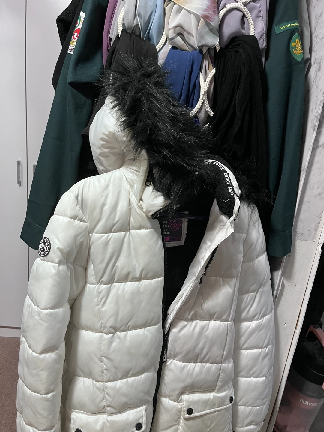 Selling a Justice white puffer jacket in size M (10/12). It has a black faux fur trim on the hood and a Justice logo detail on the zipper and hood trim. Great for keeping warm this winter!