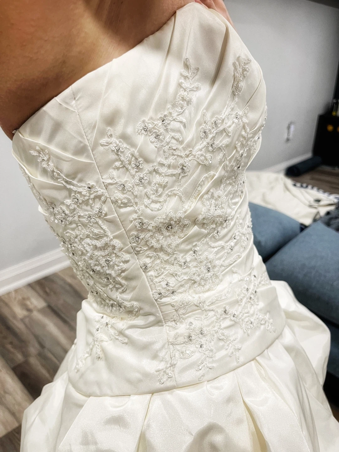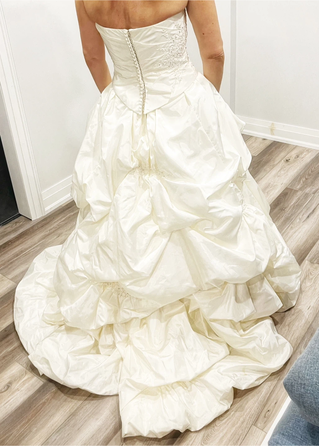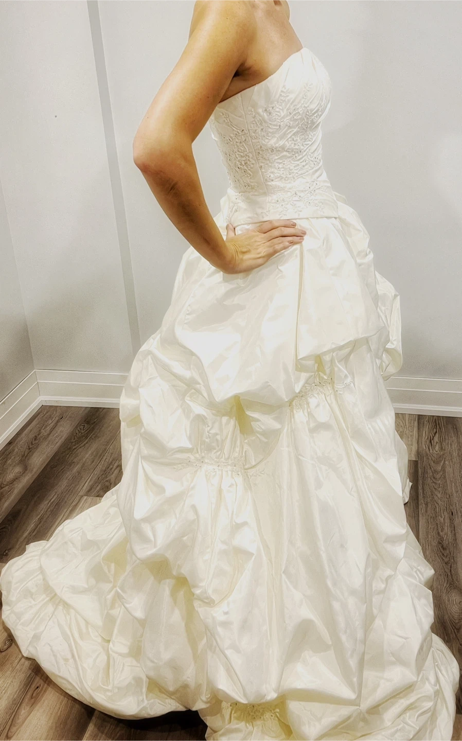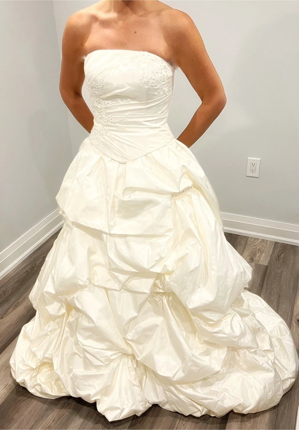 This elegant white wedding dress is perfect for your special day. Its classic design and luxurious fabric ensure you look stunning. Ideal for brides seeking timeless beauty. Tufted full billowy bottom. Zipper back with buttons and internal bra straps for support. Fits size US size 4-6. Comes with removable straps, bolero and veil (3/4 length).