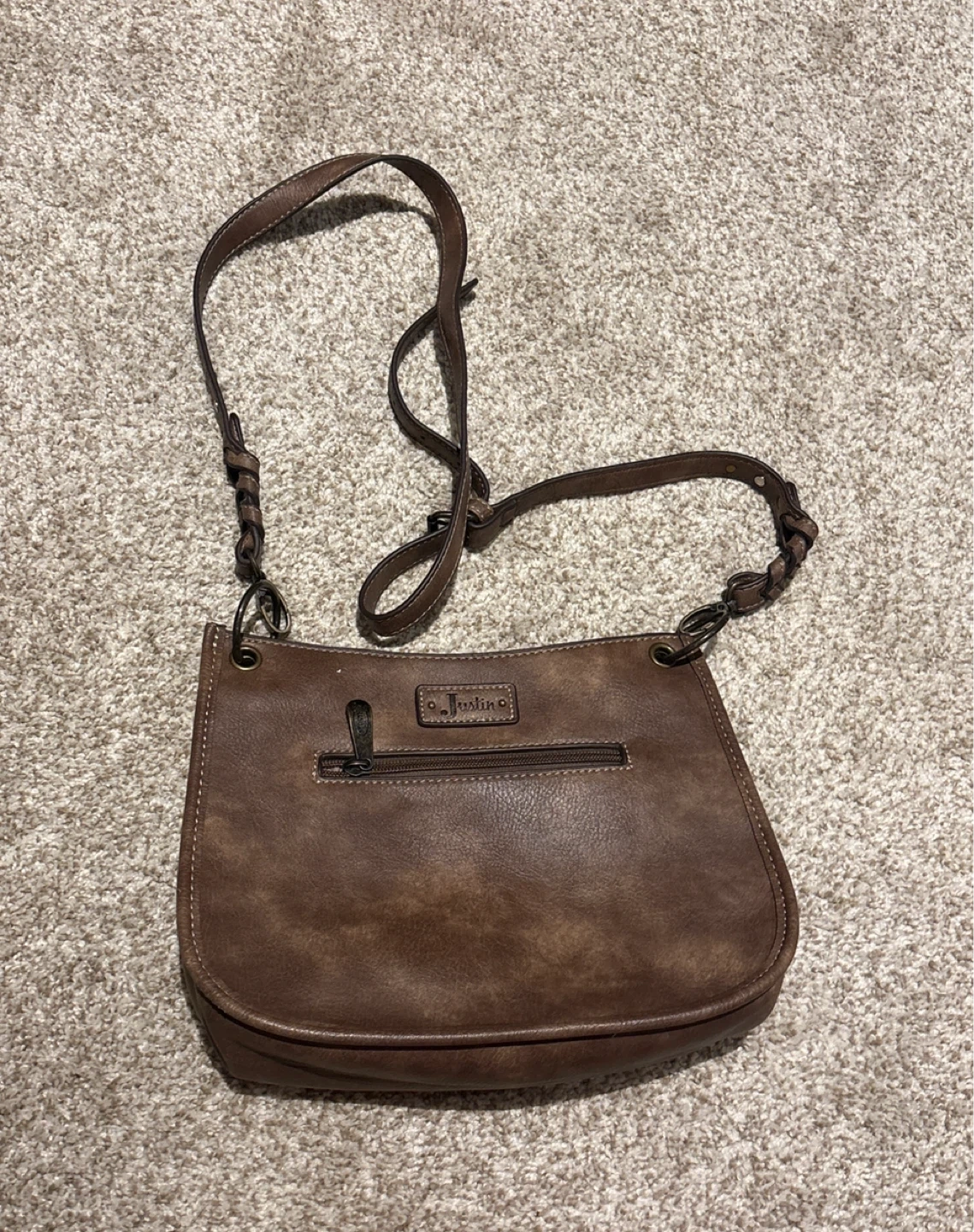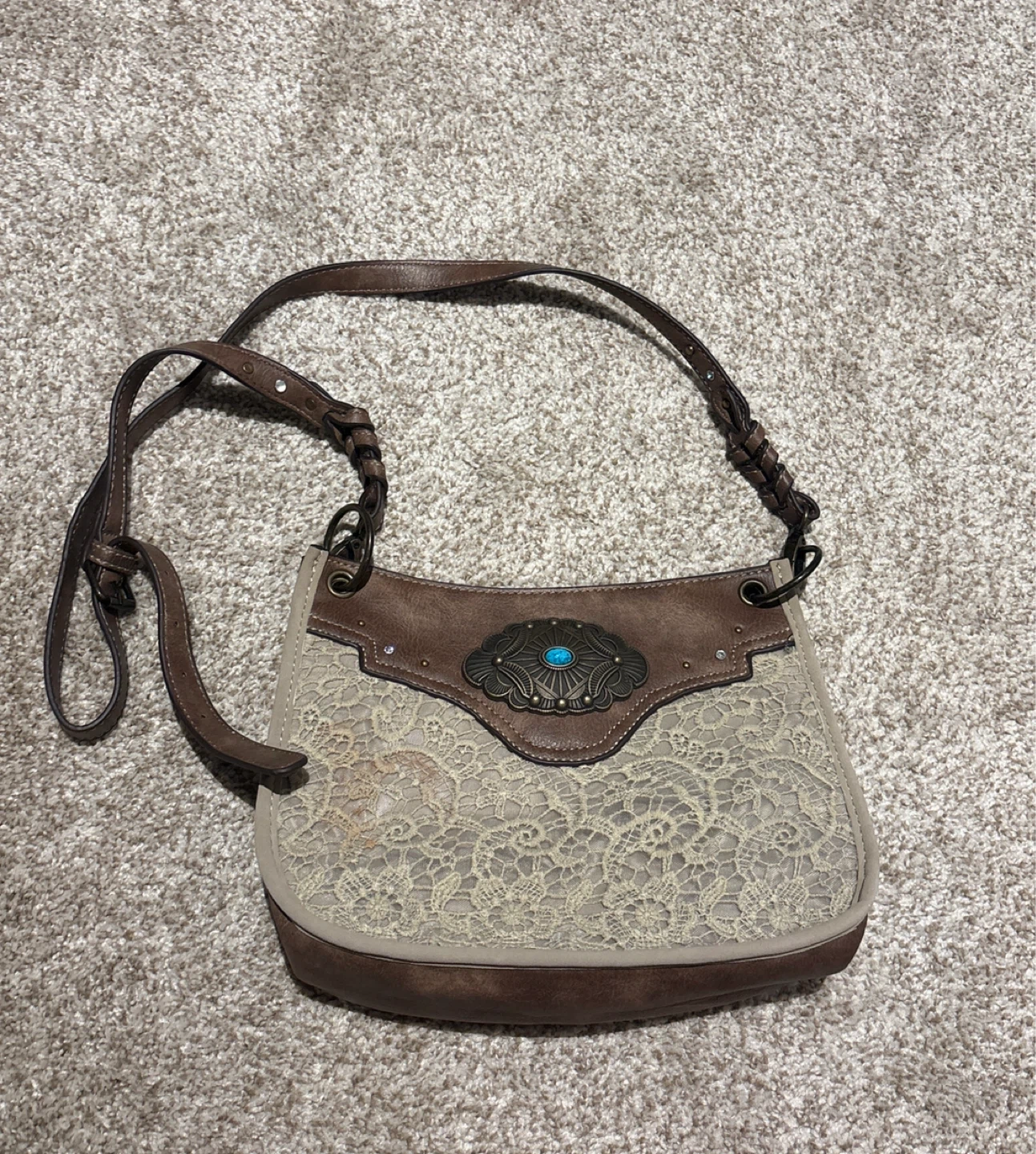 Selling Justin cross body purse. Has a mix of brown leather and lace detailing.