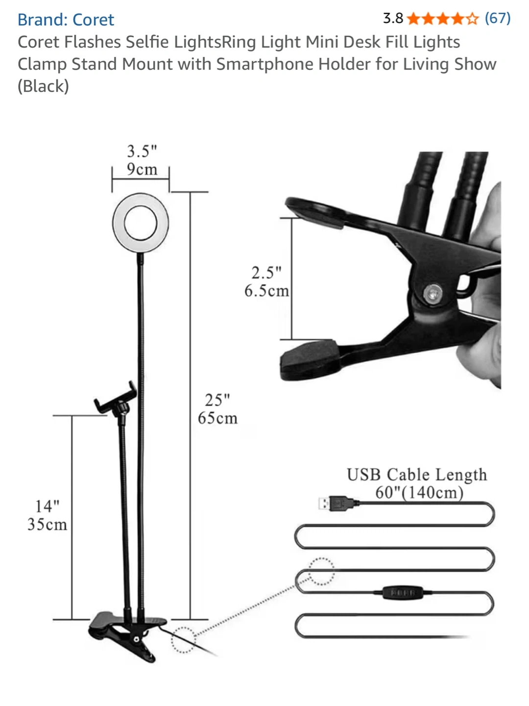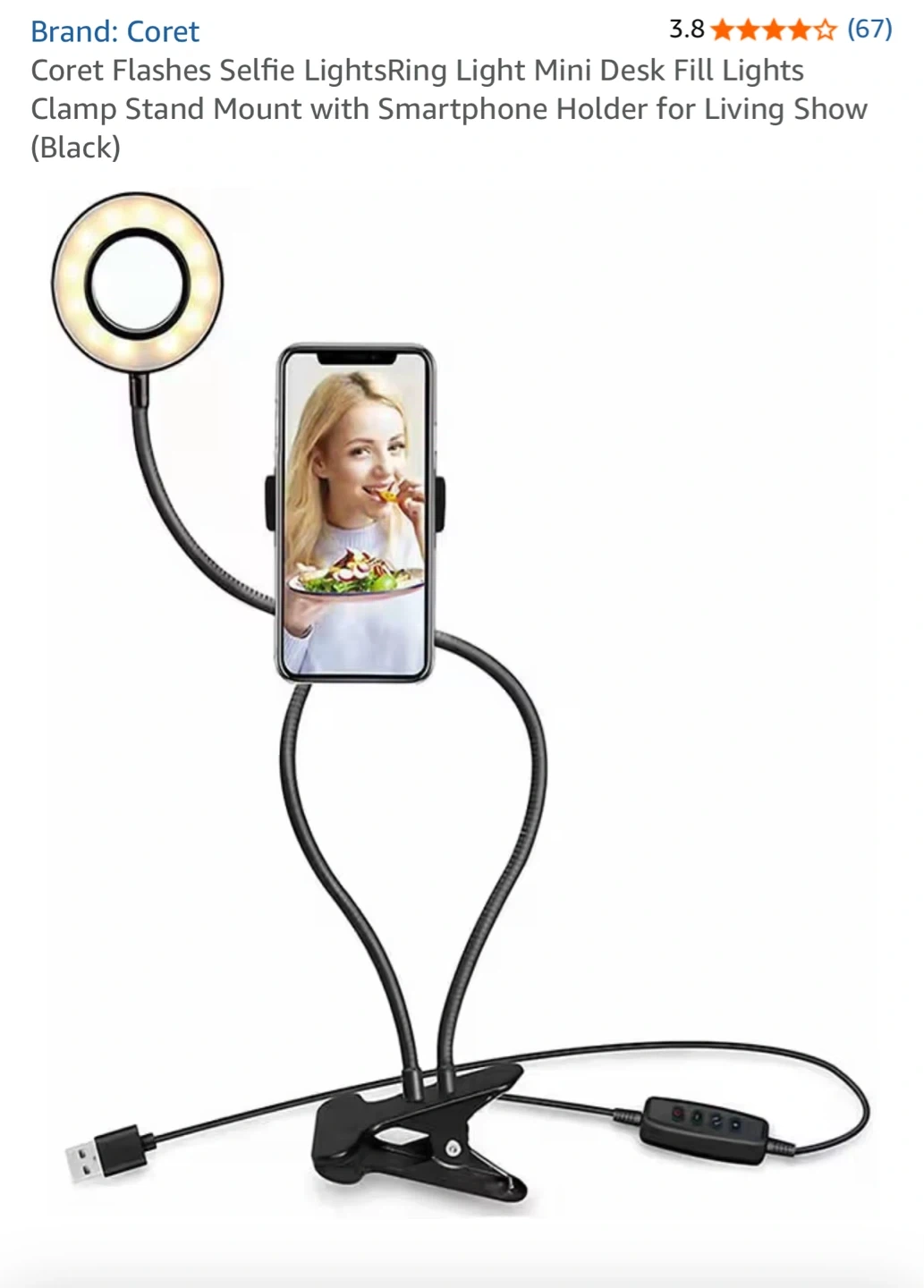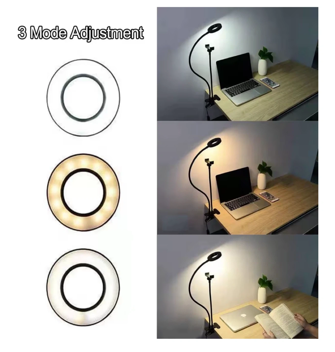 This is a ring light with a flexible gooseneck and smartphone holder. It features 3 modes of adjustment and a clamp base for easy mounting. USB powered with a 60" (140cm) cable.