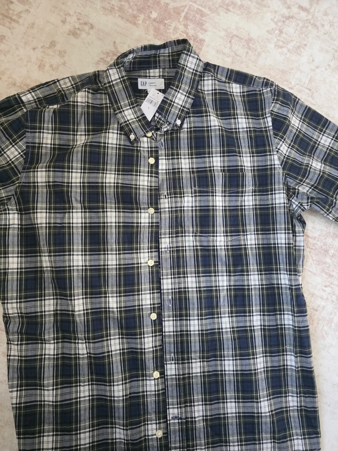 This GAP button-down shirt features a classic plaid pattern in navy, green, and white. It's a men's size large with a standard fit. The shirt is made from a comfortable fabric blend.