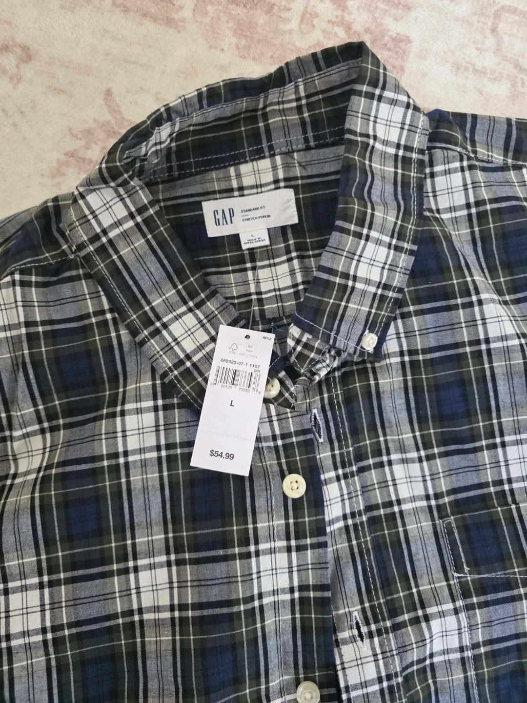 This GAP button-down shirt features a classic plaid pattern in navy, green, and white. It's a men's size large with a standard fit. The shirt is made from a comfortable fabric blend.