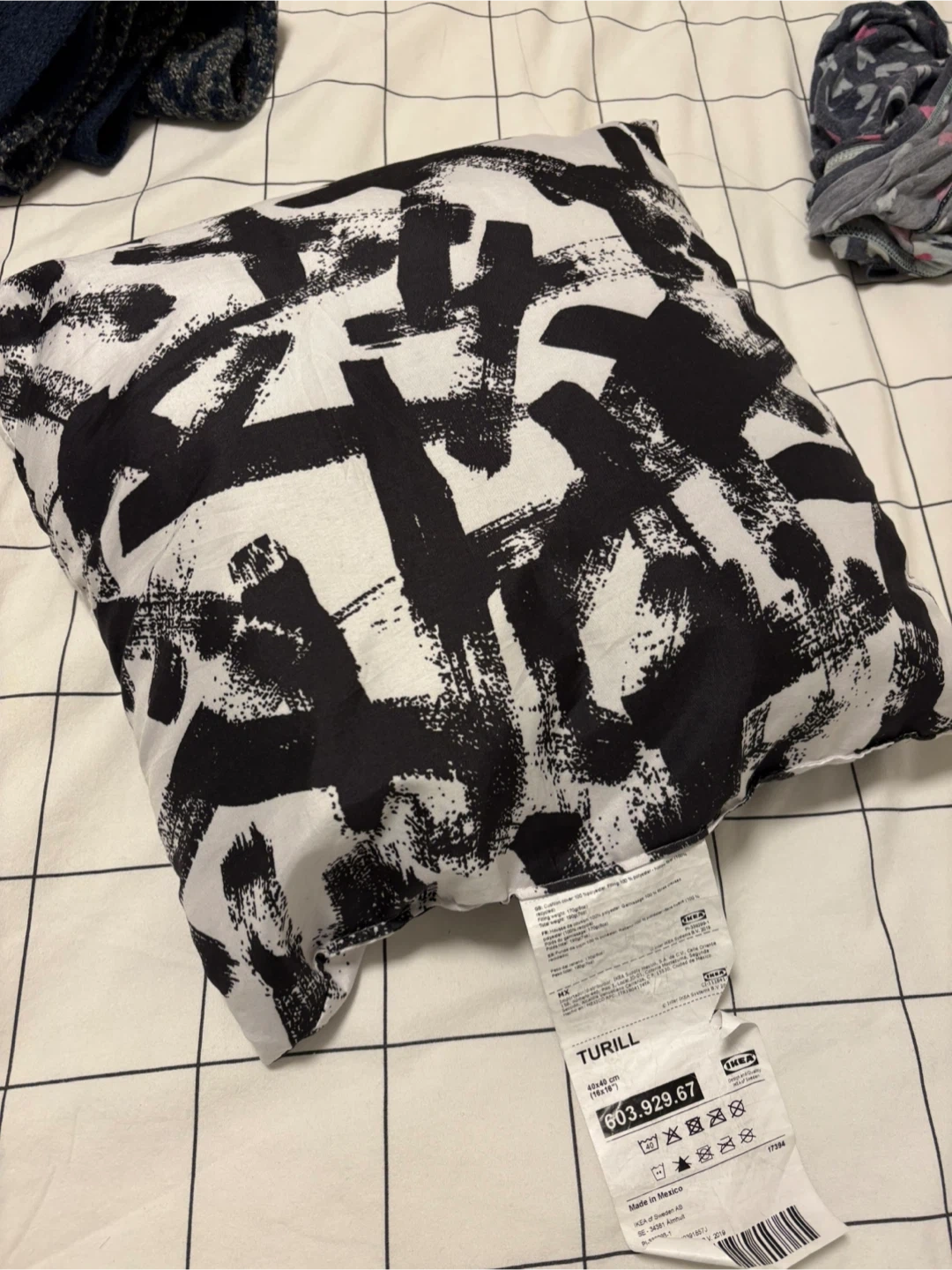 This is an IKEA TURILL cushion cover. Features a black and white abstract brushstroke pattern. Made in Mexico.
