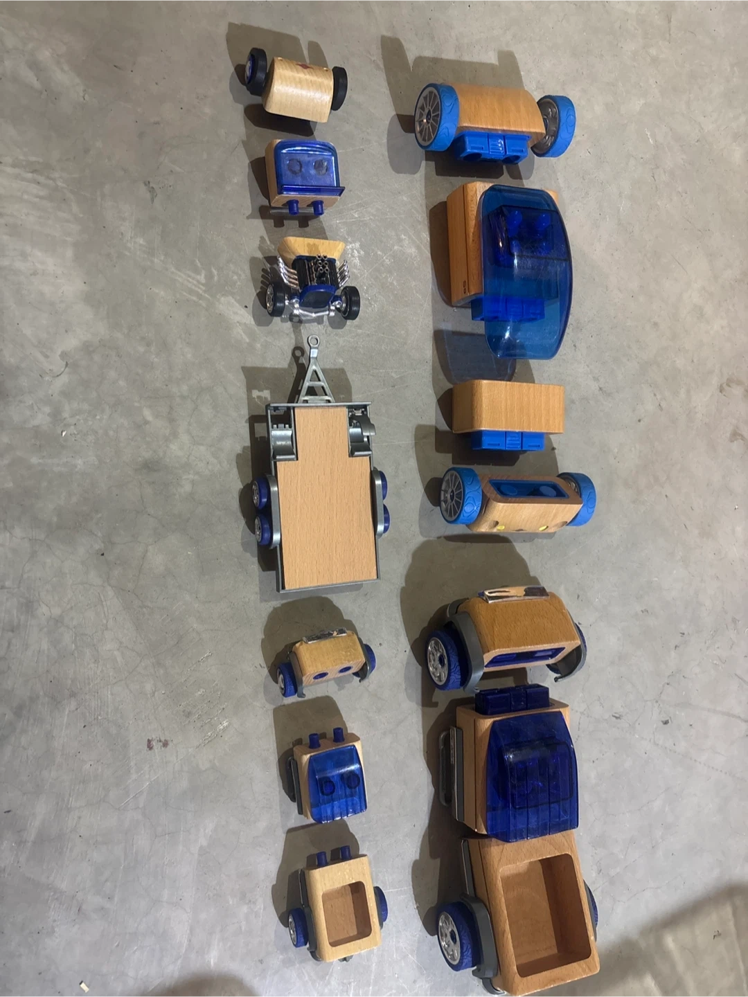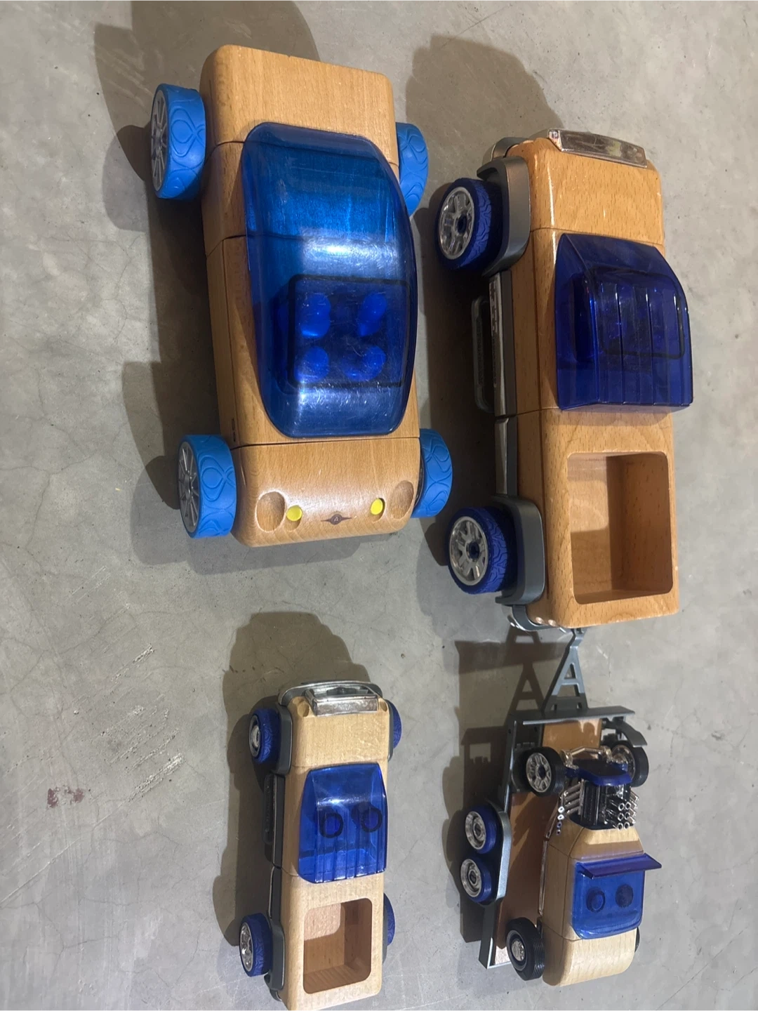 4 wooden modular vehicles plus 1 trailer, front right tire stud on the big car is cracked smaller ones are fully interchangeable