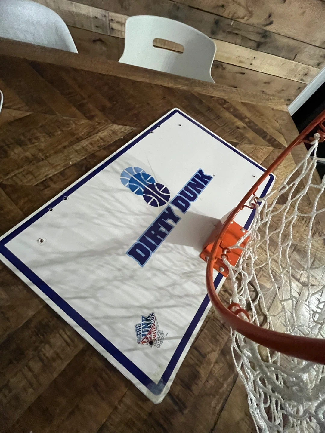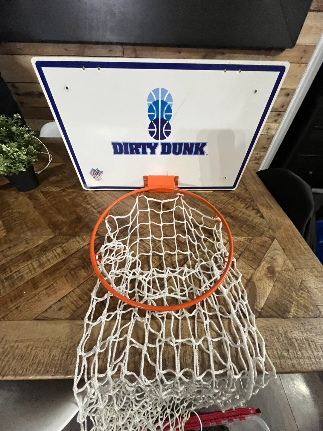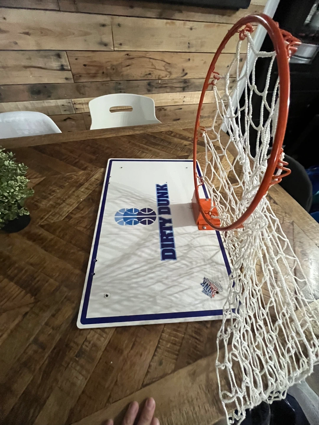 This is a Dirty Dunk basketball hoop and net laundry hamper. Mounts onto wall or door and throw in the dirty laundry.