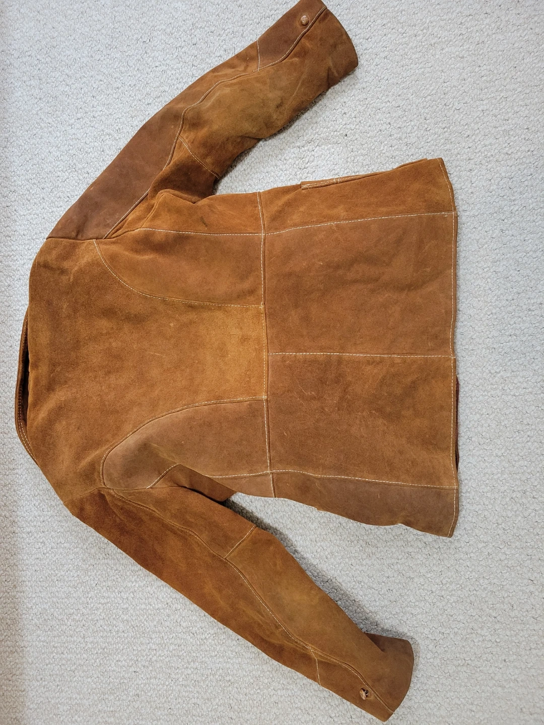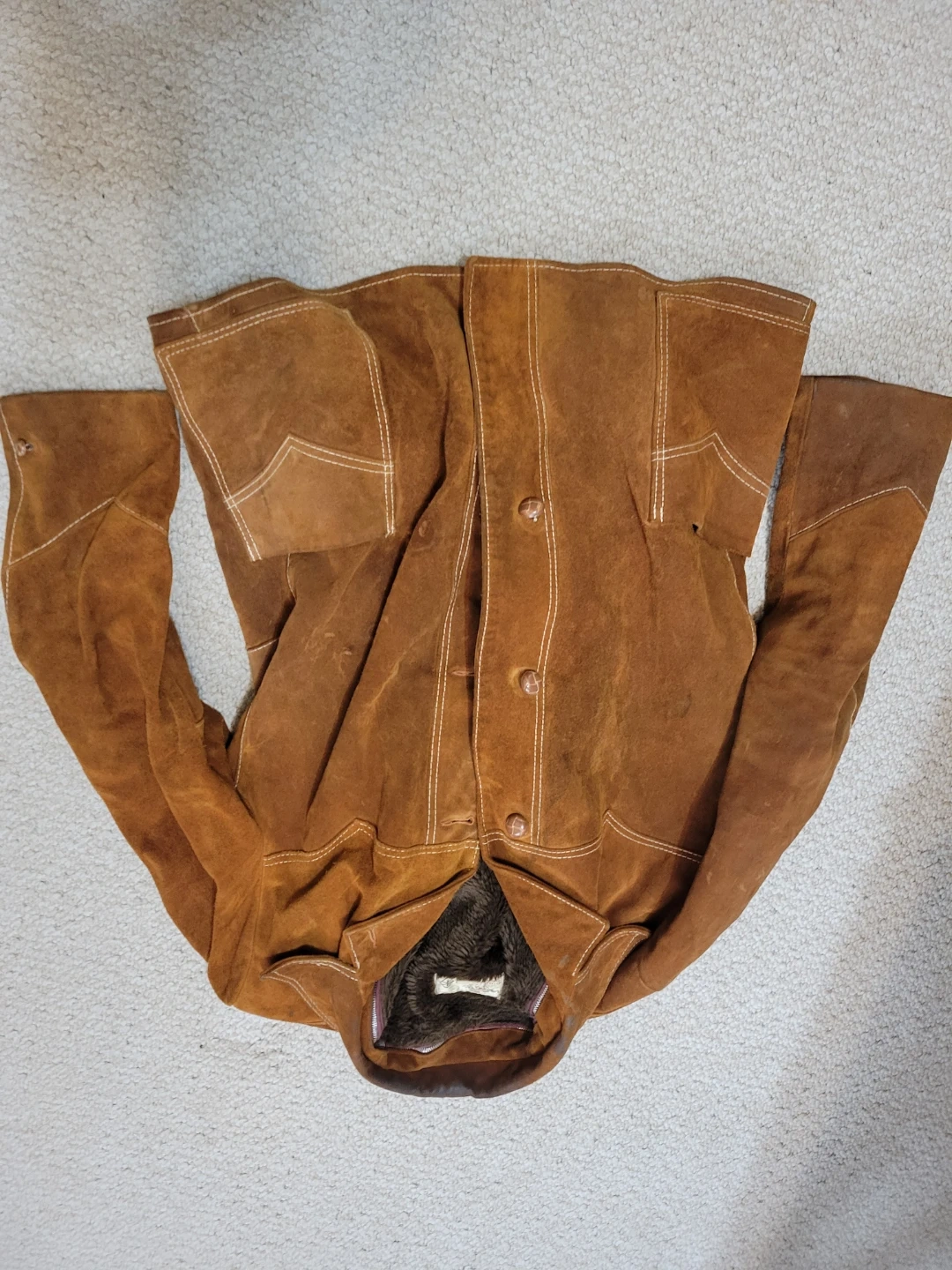 This SK Diamond Ranch Wear jacket is made with a soft suede outer and a warm sherpa lining. It features a button-up front and a zip out liner. A classic piece for cooler weather! Truly a vintage piece of clothing.