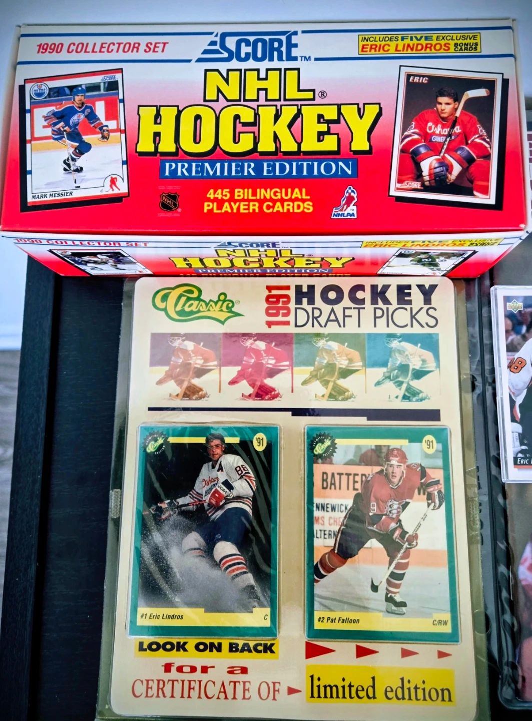 This lot includes a Beckett Hockey Monthly magazine from June 1991 featuring Eric Lindros on the cover. It also contains a 1990 Score NHL Hockey Premier Edition box with 445 bilingual player cards including the 5 Additional Bonus Lindros Cards. Additionally, you'll find a Classic 1991 Hockey Draft Picks Factory Sealed pack with cards featuring Eric Lindros. A variety of other individual Eric Lindros Rookie cards and The Seventh Inning Sketch Oshawa Generals Cards 89/90 are also included. All Cards are Like New, Nrmt-Mt. It's a great collection for any hockey fan! NOW ONLY $40 FIRM.