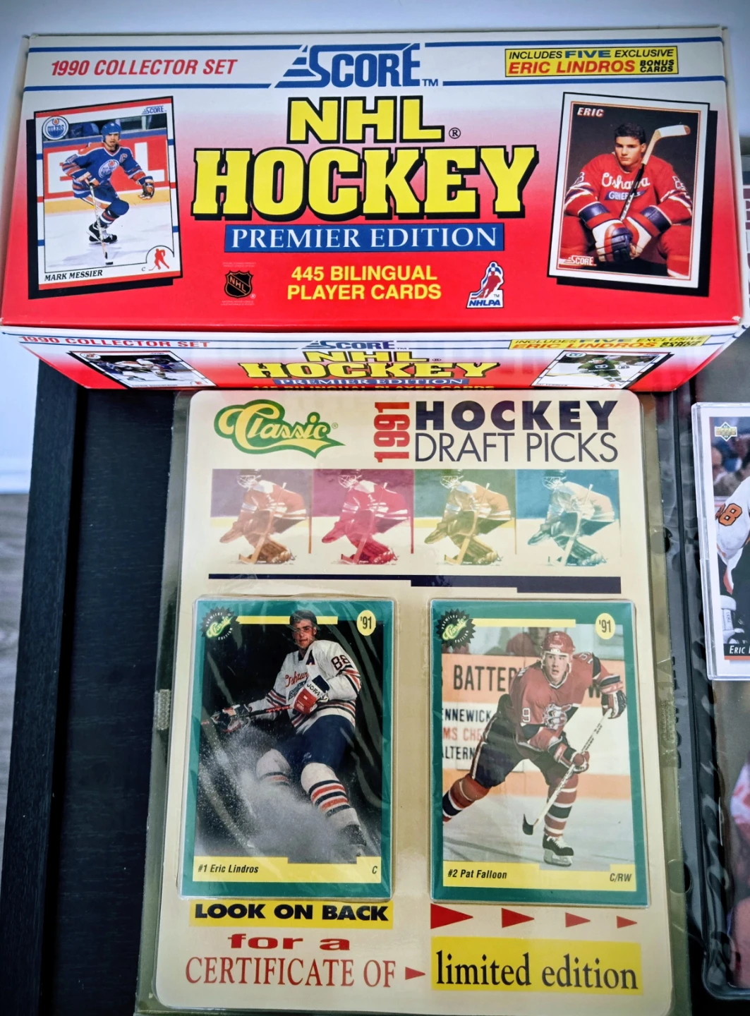 This lot includes a Beckett Hockey Monthly magazine from June 1991 featuring Eric Lindros on the cover. It also contains a 1990 Score NHL Hockey Premier Edition box with 445 bilingual player cards including the 5 Additional Bonus Lindros Cards. Additionally, you'll find a Classic 1991 Hockey Draft Picks Factory Sealed pack with cards featuring Eric Lindros. A variety of other individual Eric Lindros Rookie cards and The Seventh Inning Sketch Oshawa Generals Cards 89/90 are also included. All Cards are Like New, Nrmt-Mt. It's a great collection for any hockey fan! NOW ONLY $40 FIRM.