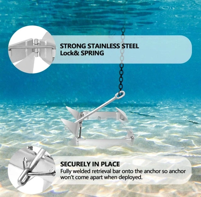 This brand new boat anchor is made from strong stainless steel, designed to securely hold your boat in place on sand, mud, or weed bottoms. Its double-sided design prevents dragging and sliding, ensuring your boat stays put, and it conveniently folds for easy storage. Specifications: Material: Stainless Steel Size: 78cm/30.7inch x 34.2cm/13.4inch x 7.5cm/2.95inch Effective for: Sand, Mud, and Weed Bottoms Features: Folds for storage, double sided to stop drag & slide.