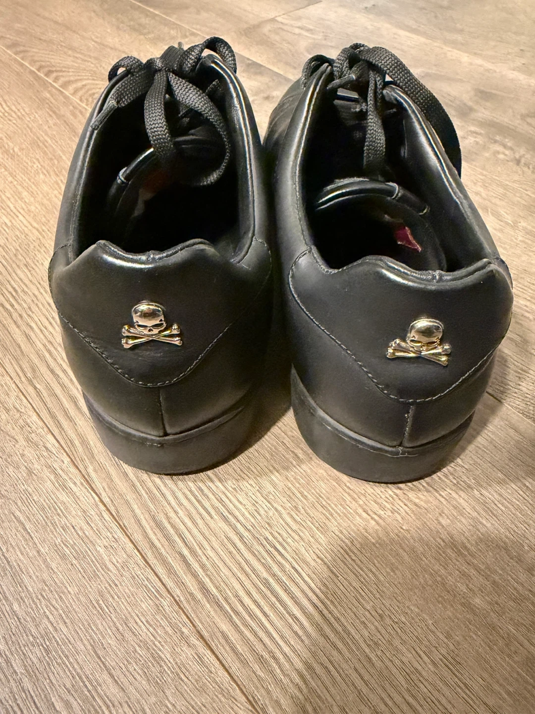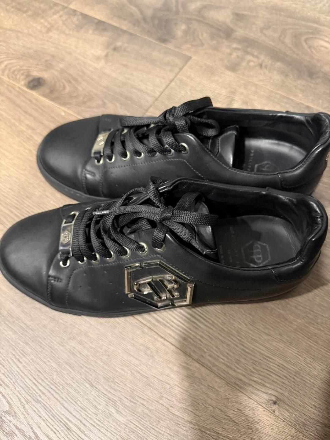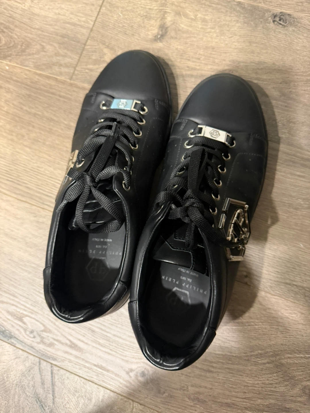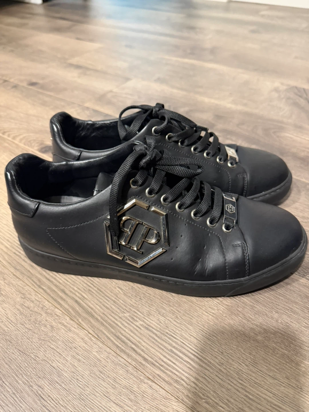 These are black leather low-top sneakers by Philipp Plein. They feature the brand's signature logo embellishment on the sides and a skull and crossbones detail on the heel. Made in Italy.